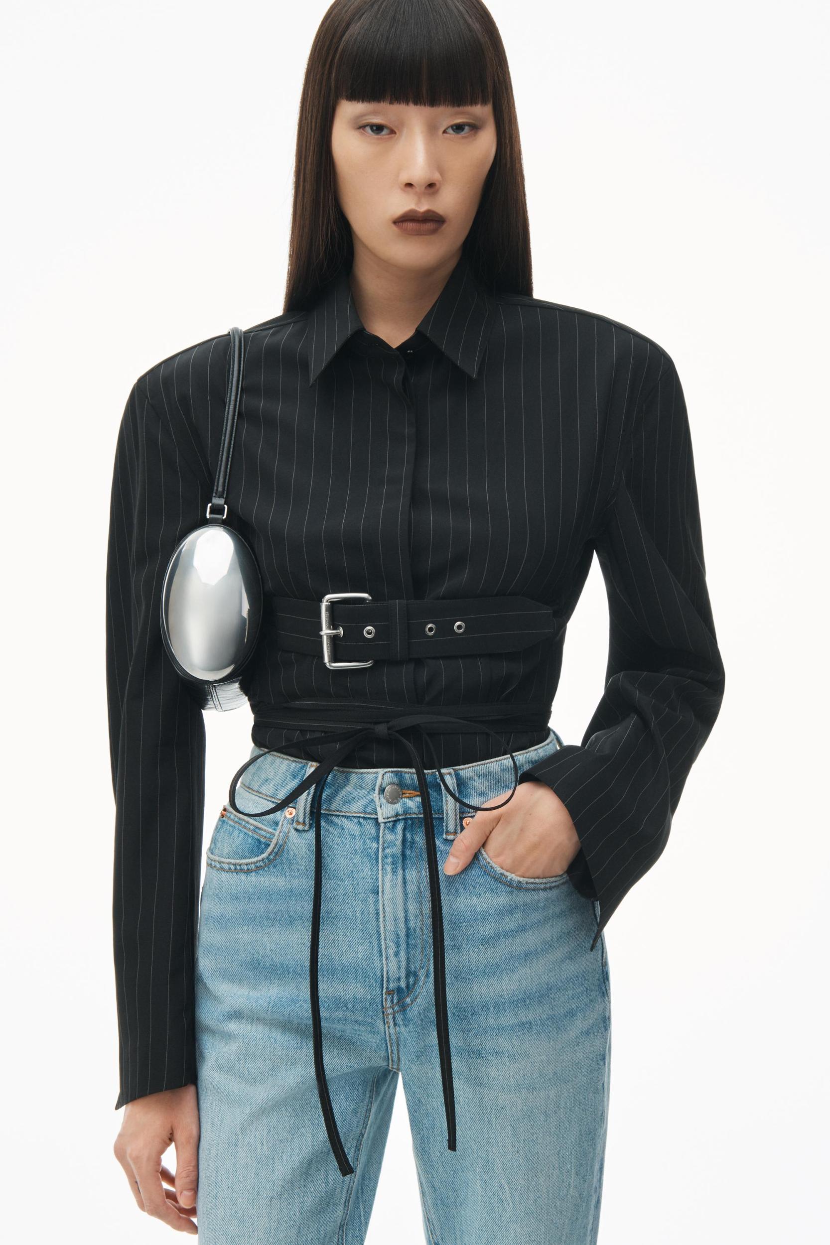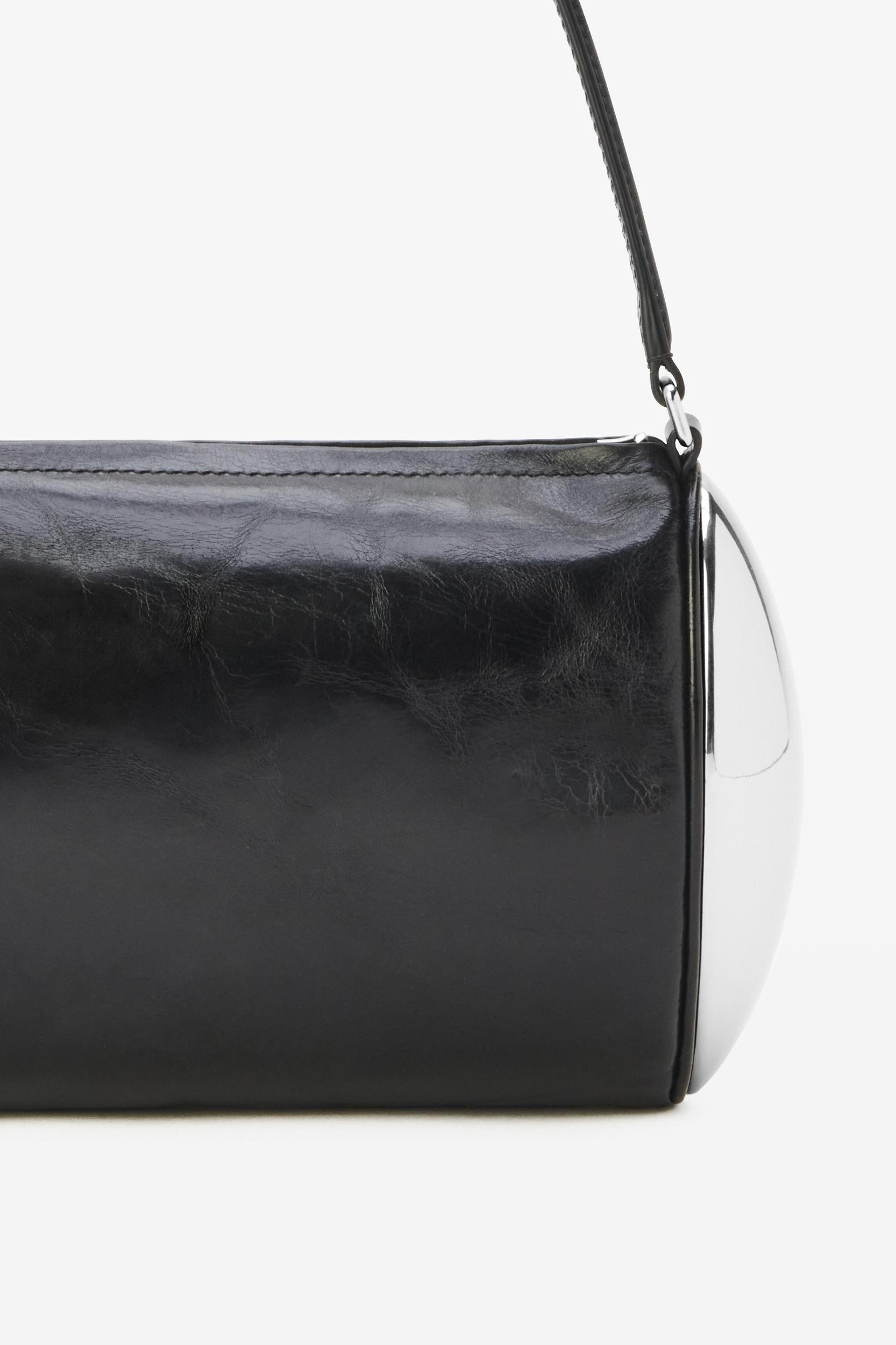 Flanked by Dome hardware on each side, this crackle patent leather pouchette fastens with a top-zip opening with one main compartment and an internal card pocket and is finished with a shoulder strap.