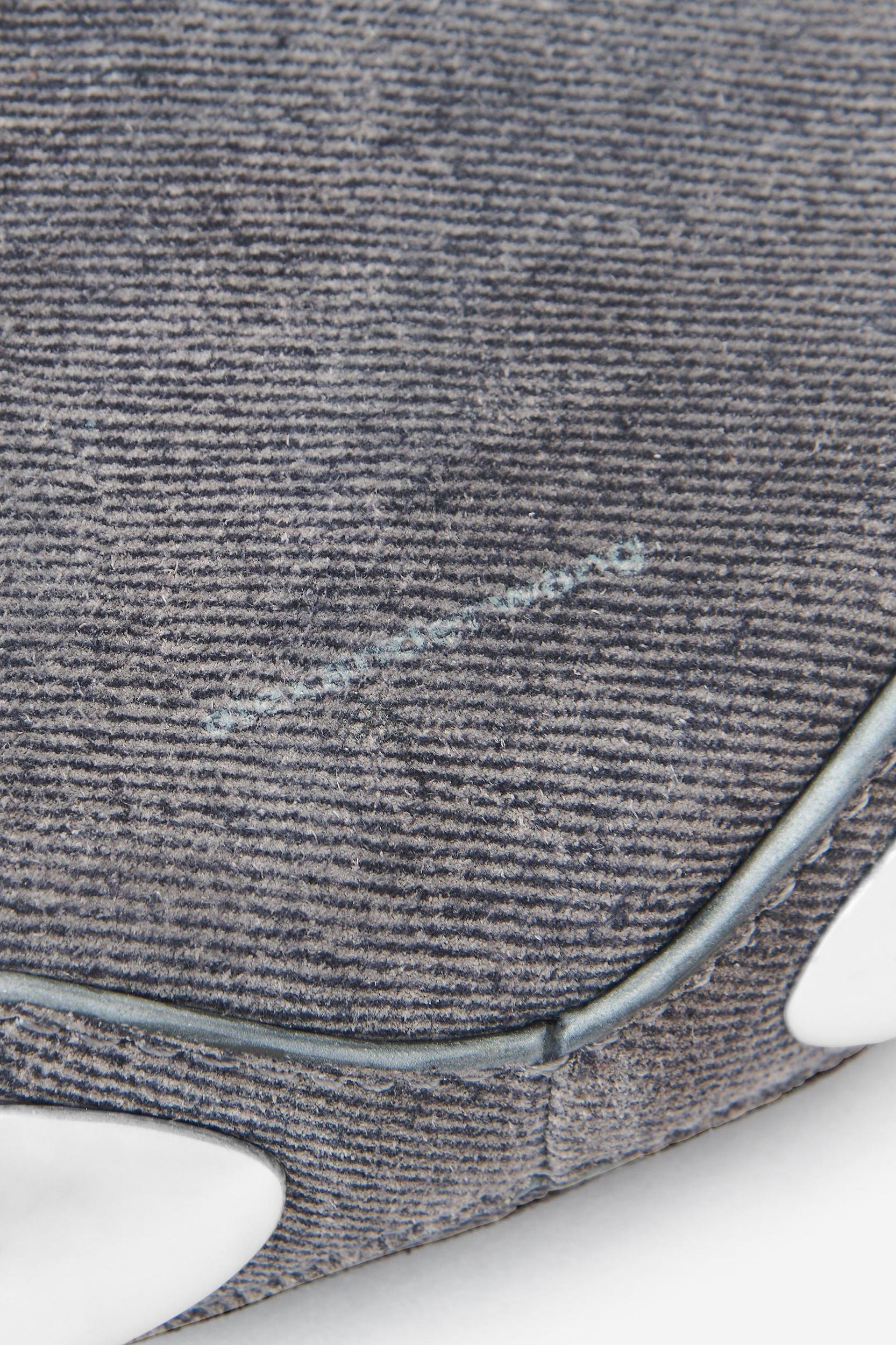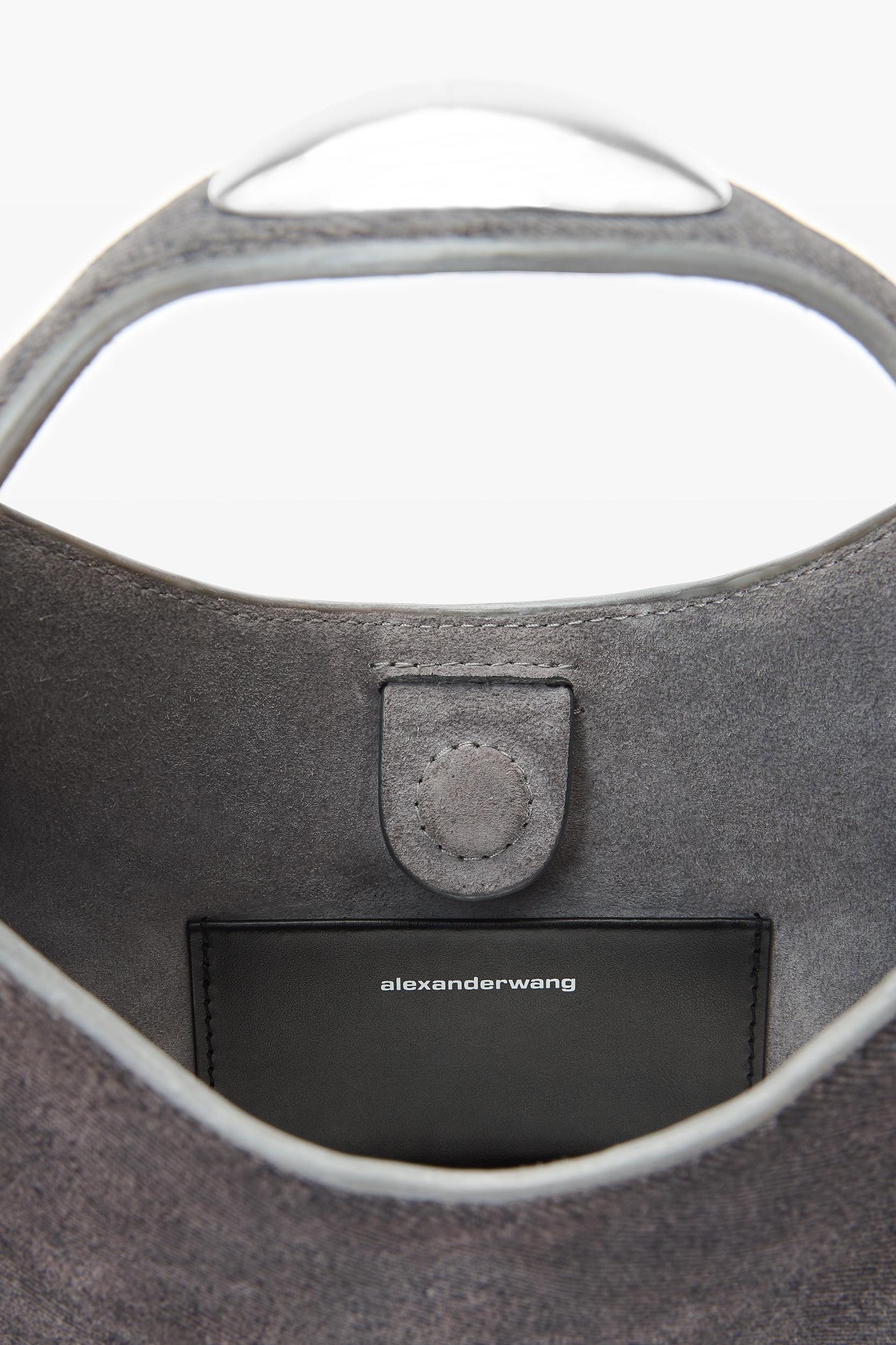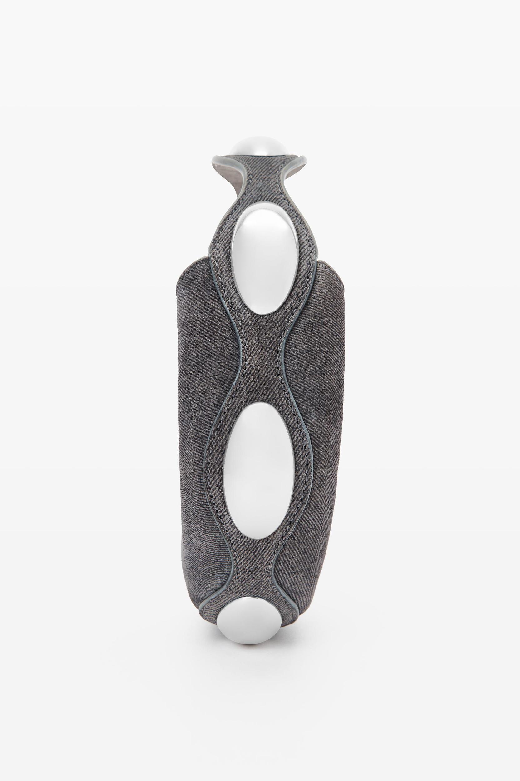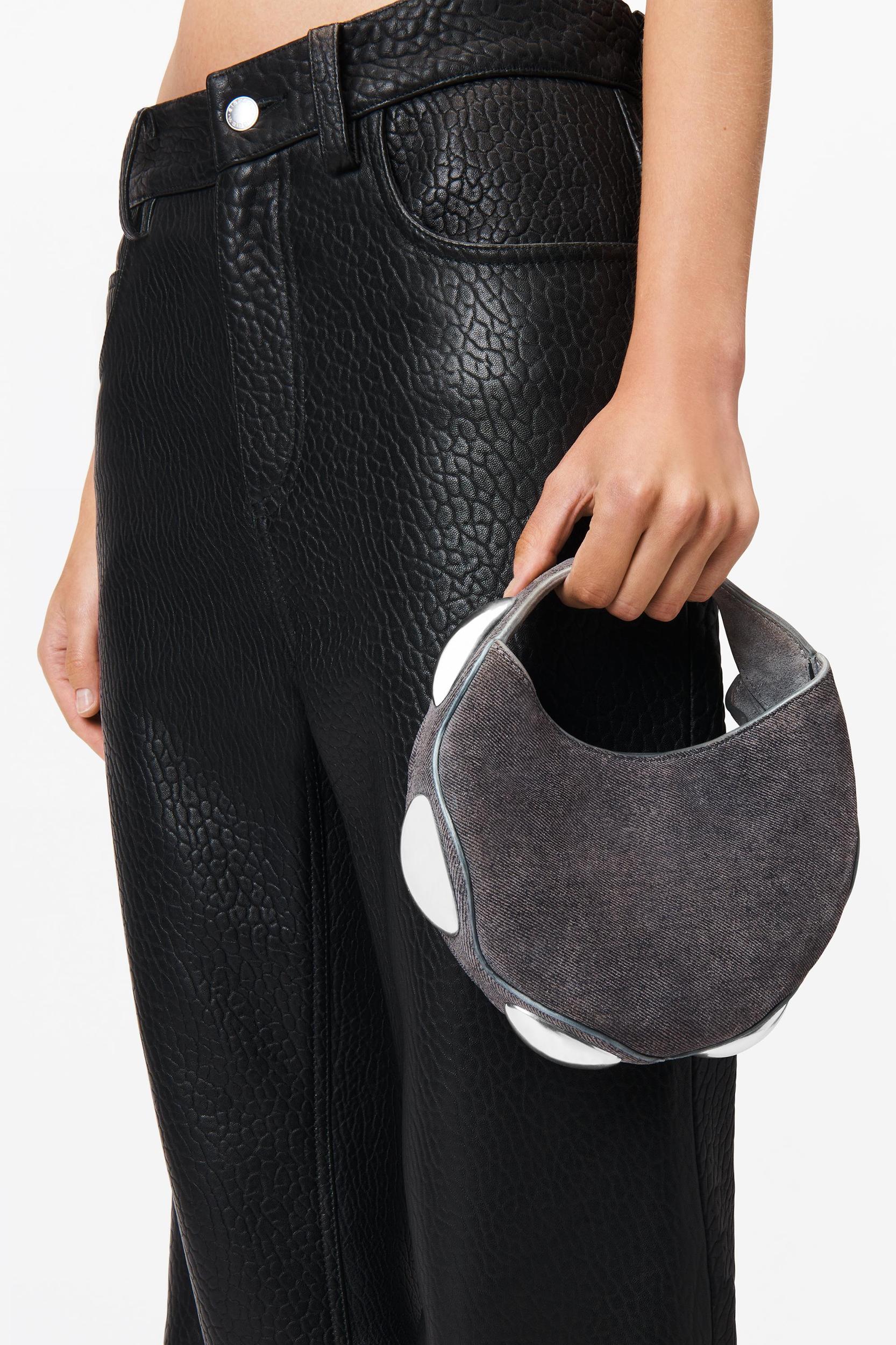 a scalloped perimeter featuring dome hardware elevates this top-handle bag in grey trompe-l'oeil denim leather.