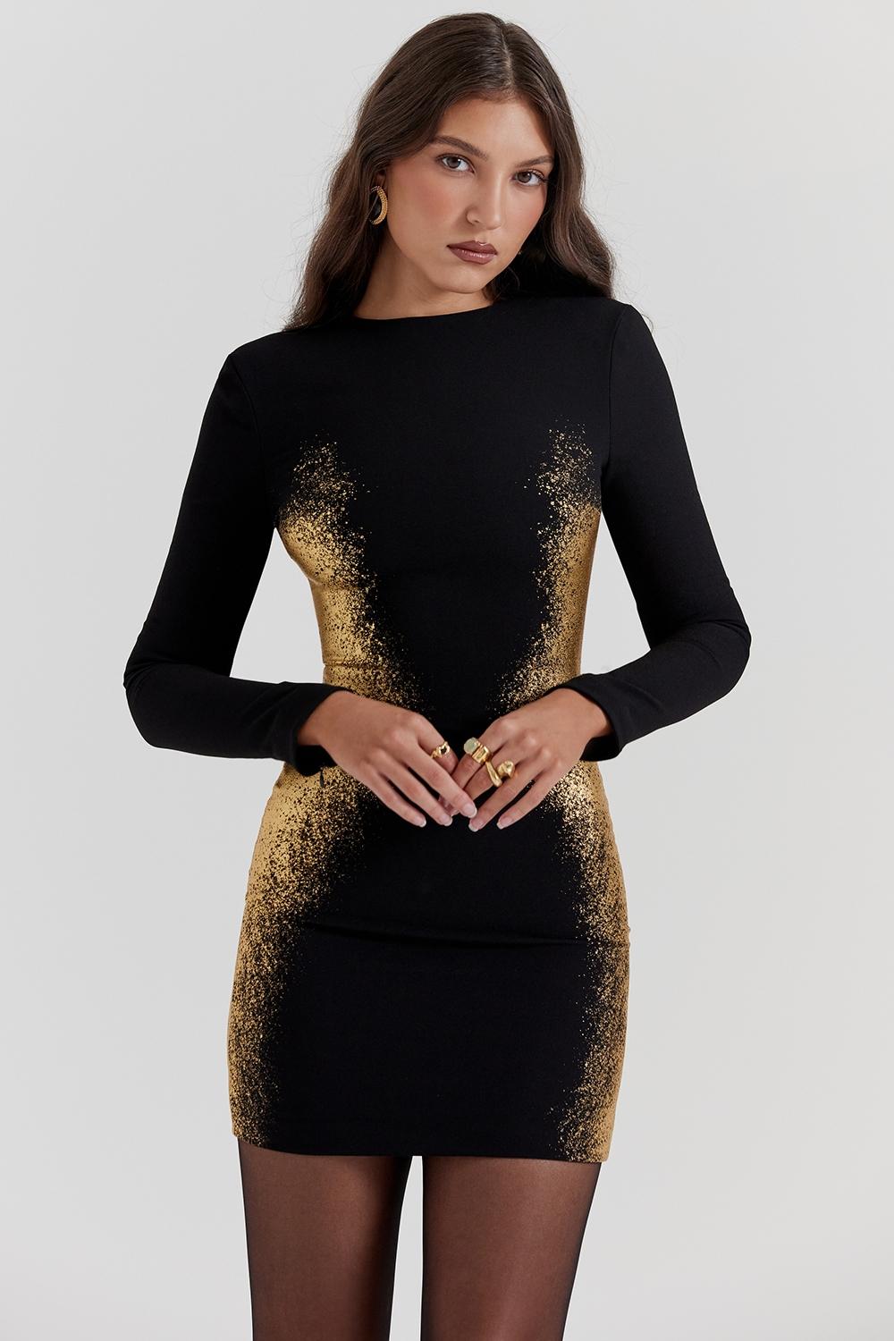 Our 'Domenica' mini dress is part of our glamorous party collection that's designed especially for the Holiday season. It features a lustrous gold foil illusion print to the front and back and has a figure hugging silhouette.