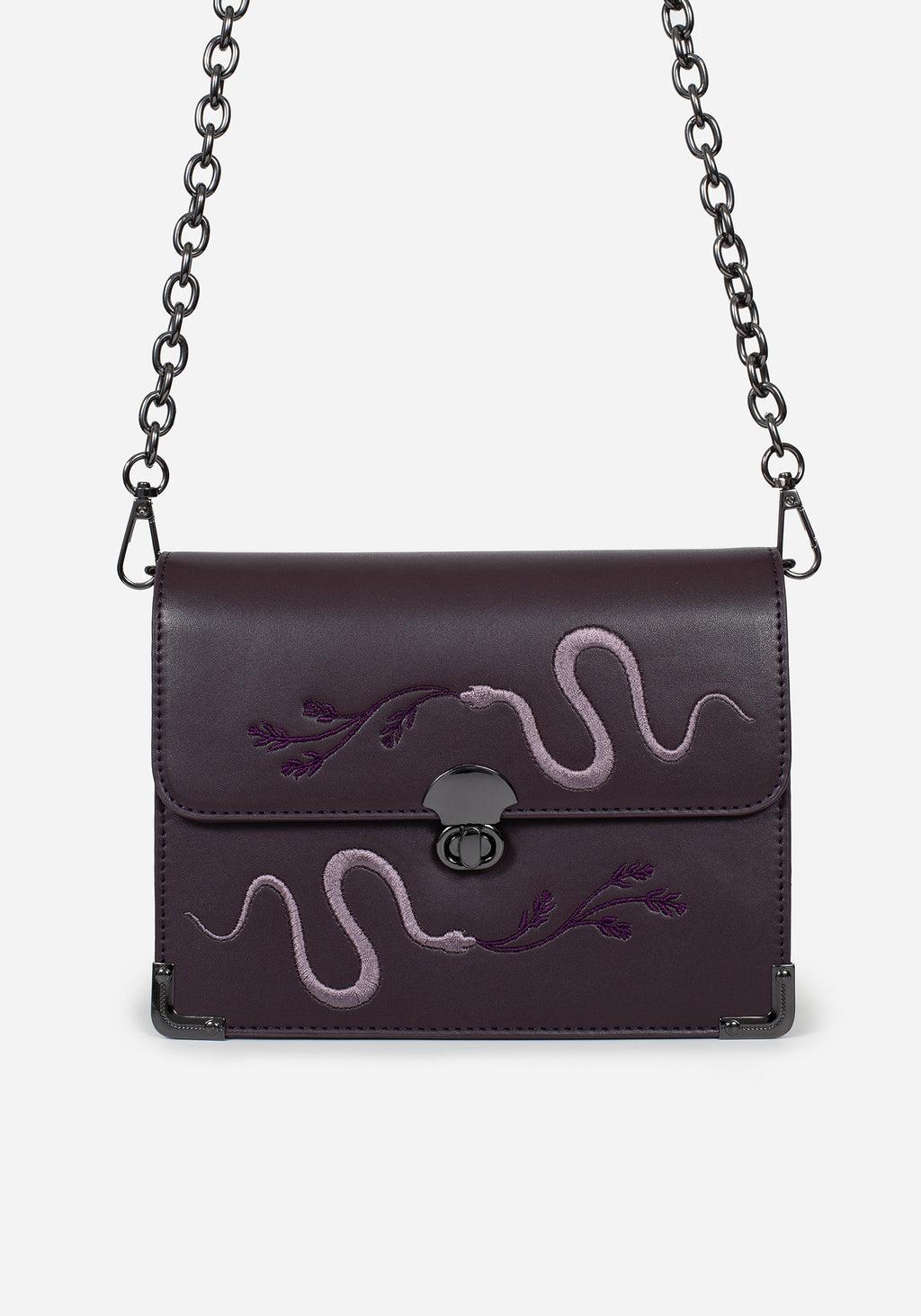 Make a heav'n of hell & a hell of heav'n- Purple snake embroidered faux leather mini shoulder bag - Dainty size holds essentials for easy access - Sturdy box shape stays structured - Front flap fastens with a twist closure - Removable chain shoulder strap with a pleather section for comfort - Main compartment features one zipped pocket & one pouch - Sleek purple PU leather with lilac snake embroidery - Gunmetal hardware adds a cold edge - May we tempt you? Main: 100% PU Lining: 100% cotton