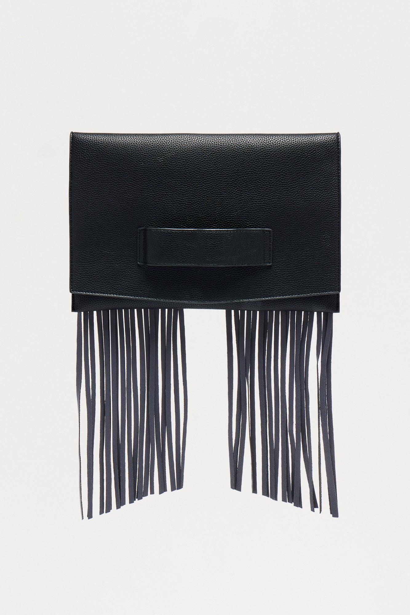Available In Black. Clutch Bag Foldover Closure Faux Leather Material Slip Through Handle Fringe Trim Detail Dimensions: 13"1" 8.75 Imported California Proposition 65WARNING: Cancer and Reproductive Harm - www.P65Warnings.ca.gov.