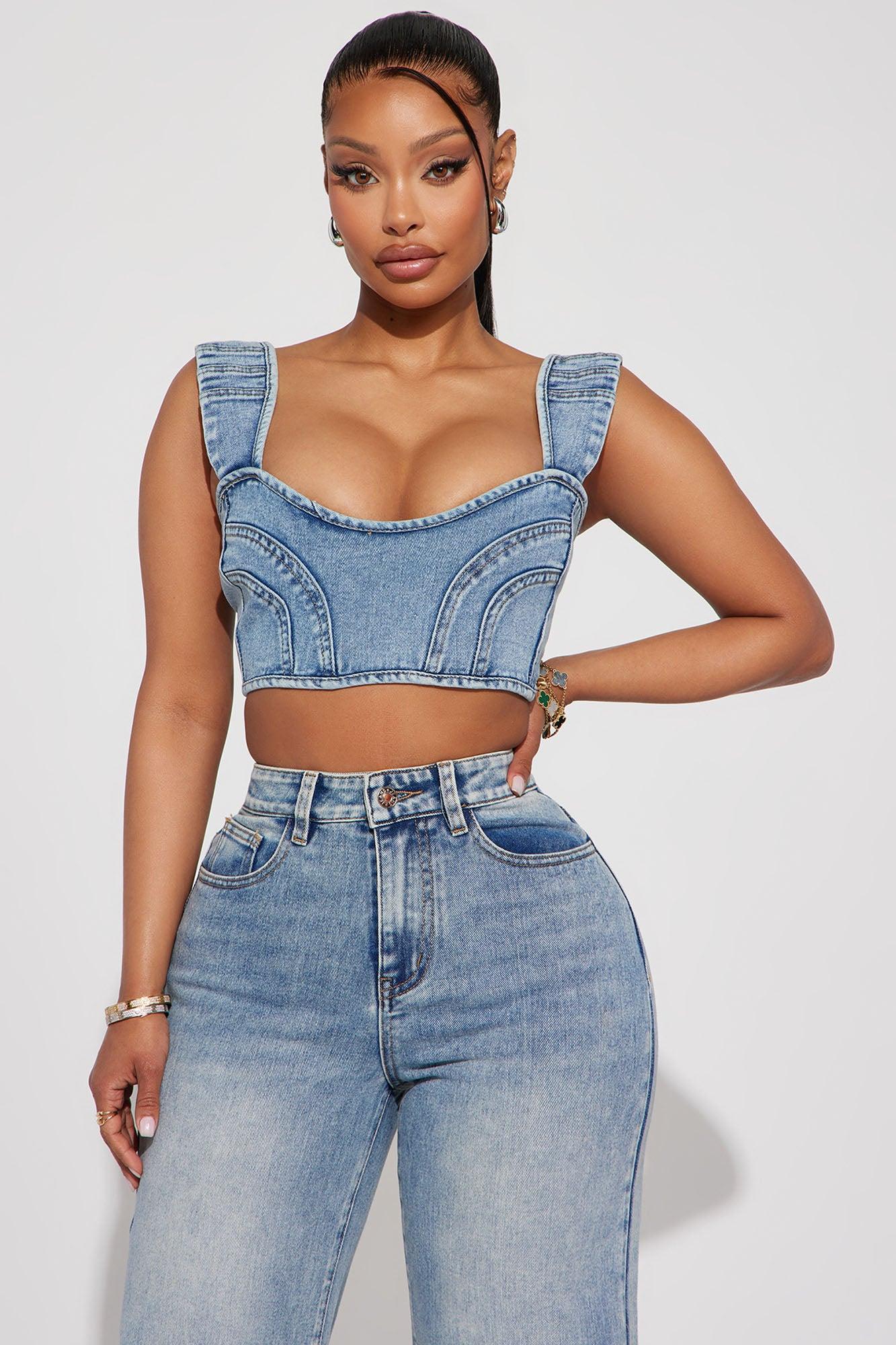 Available In Medium Wash. Denim Pant Set Bra Top Sleeveless Back Zipper Wide Leg Pant Button And Zipper Closure Front And Back Pockets Non Stretch 33" Inseam Disclaimer: Due To The Specialized Wash Process, Each Garment Is Unique. 56.9% Cotton 33.2% Polyester 8.6% Viscose 1.3% Spandex Imported California Proposition 65WARNING: Cancer and Reproductive Harm - www.P65Warnings.ca.gov.