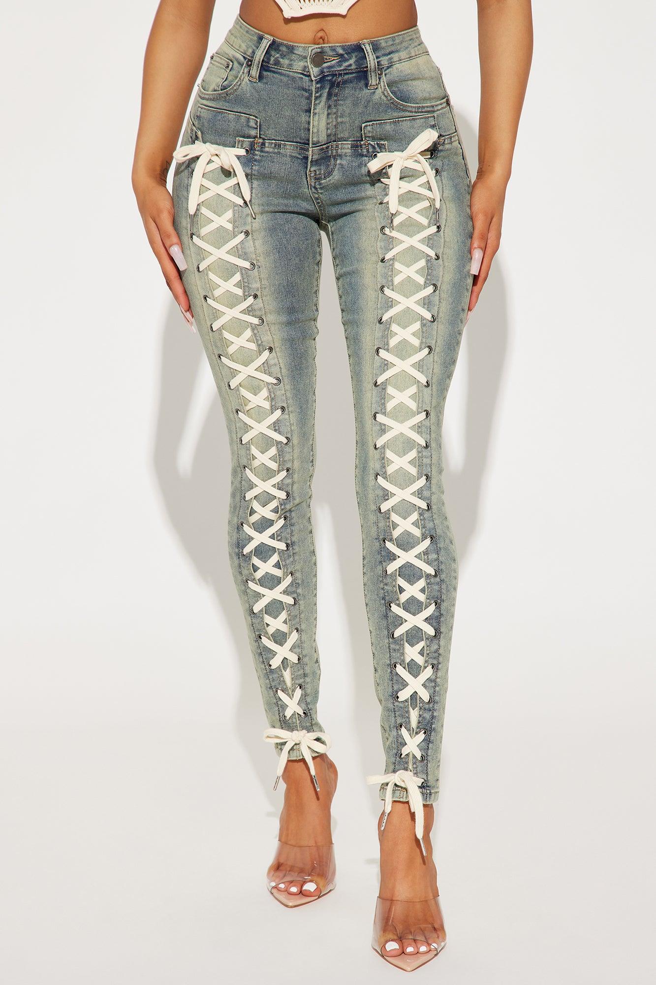 Available In Vintage Wash. Skinny Jean Adjustable Lace Up Front Tinted 5 Pocket 10.5" High Rise 28" Inseam Medium Stretch Disclaimer: Due To The Specialized Wash Process, Each Garment Is Unique. 68% Cotton 27% Polyester 3% Rayon 2% Spandex Imported