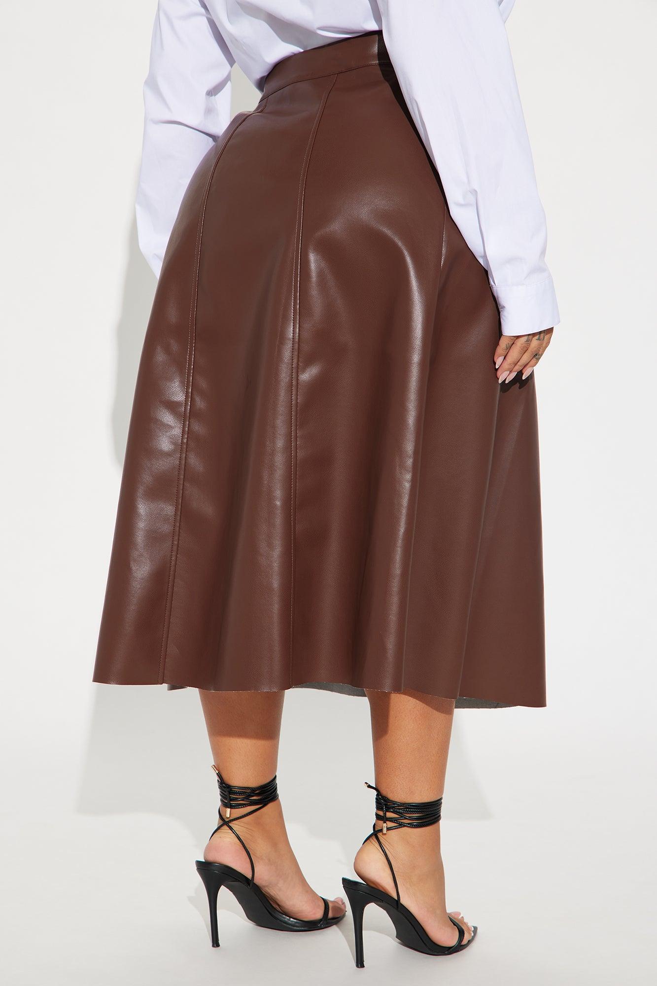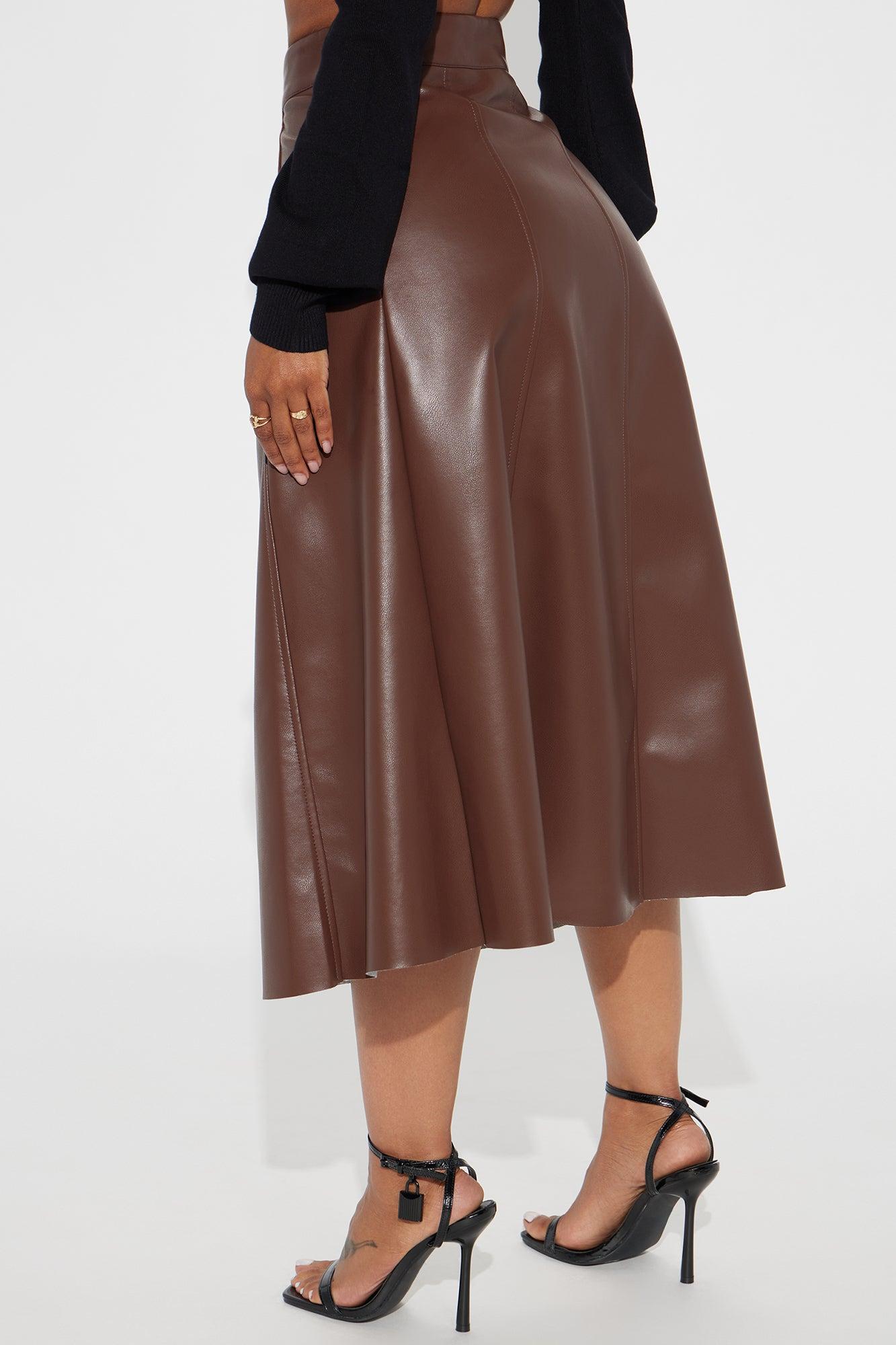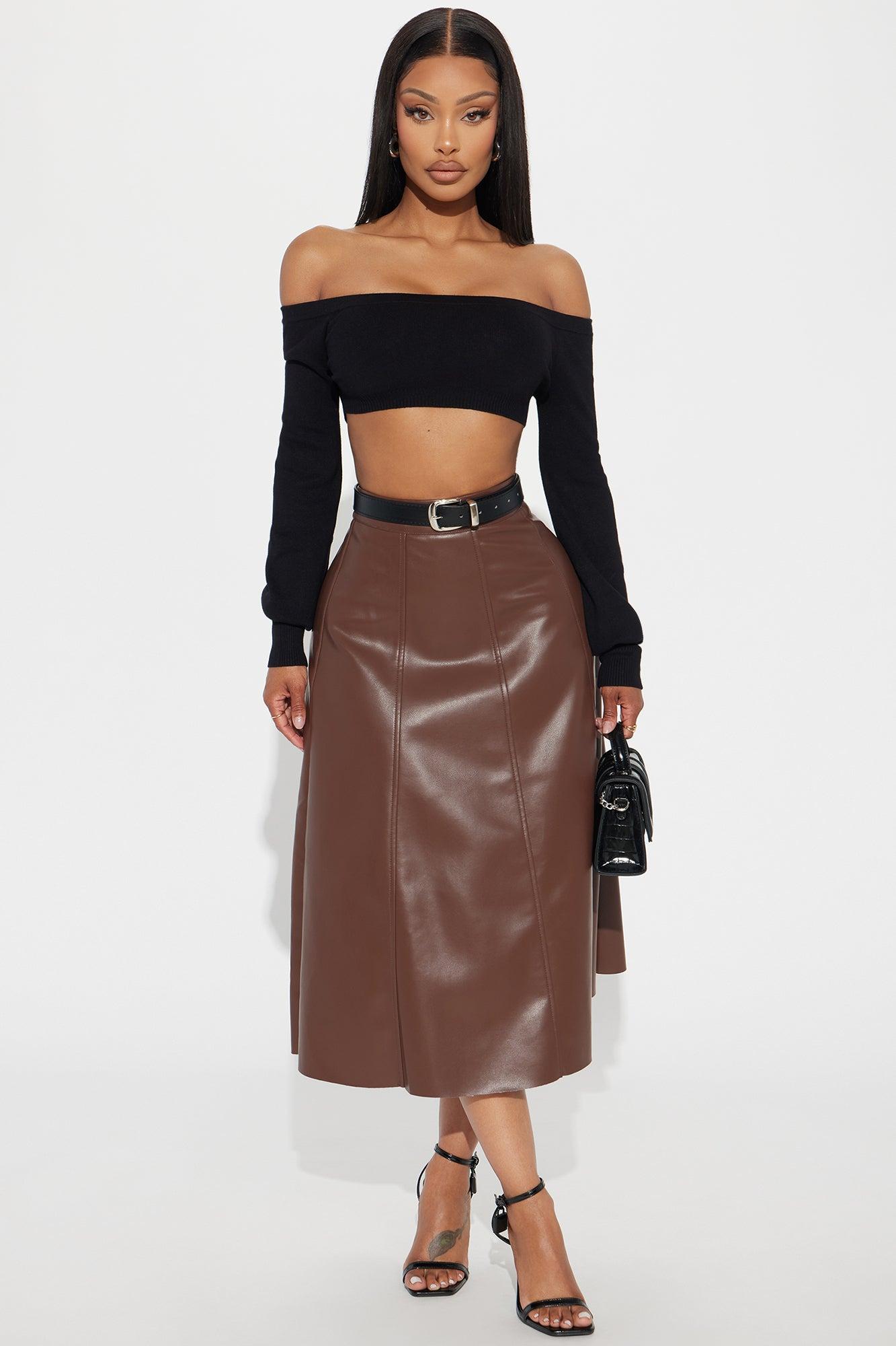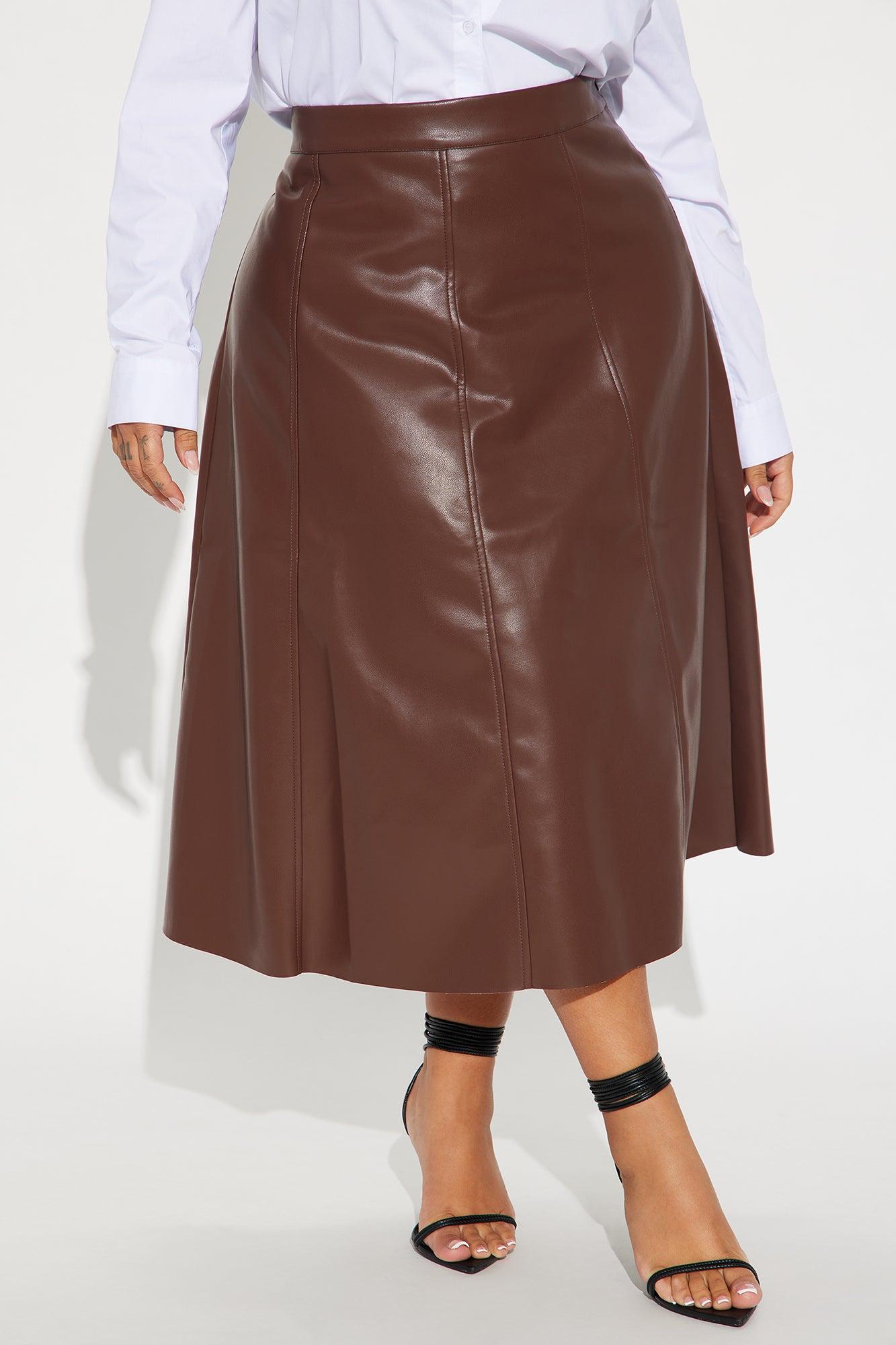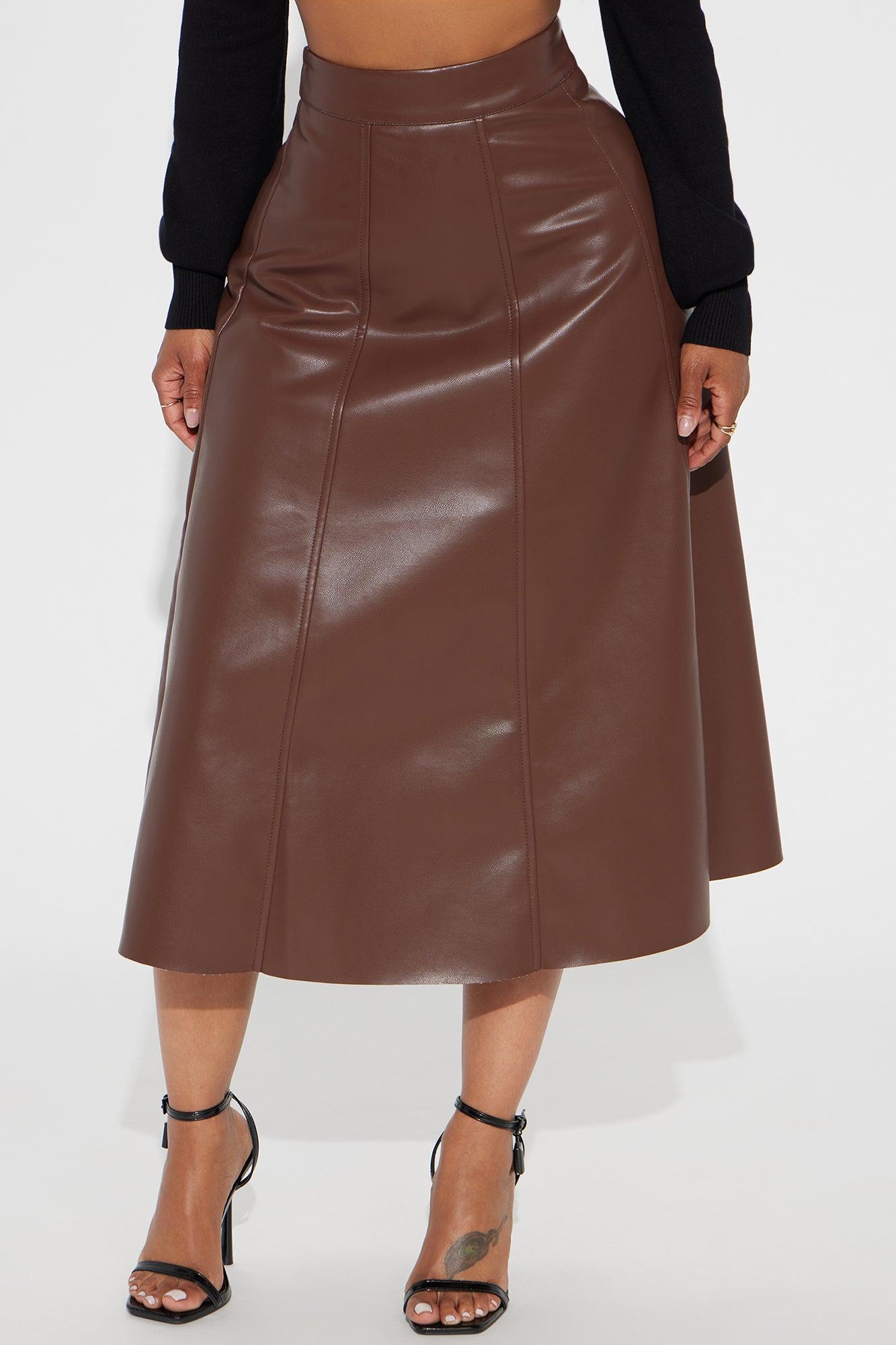 Available In Black And Brown. Midi Skirt High Rise Hidden Side Zipper Faux Leather Non Stretch Shell Facing: 100% Polyurethane Shell Backing: 100% Polyester Imported California Proposition 65 WARNING: Cancer and Reproductive Harm - www.P65Warnings.ca.gov.