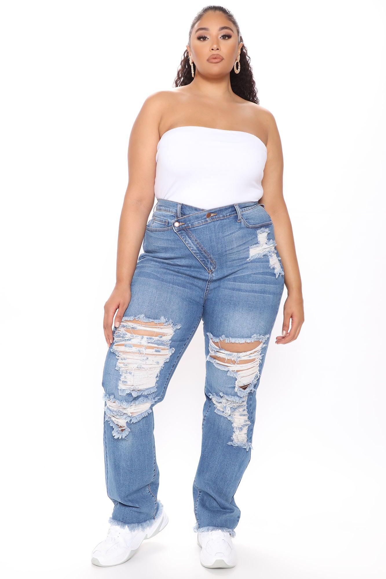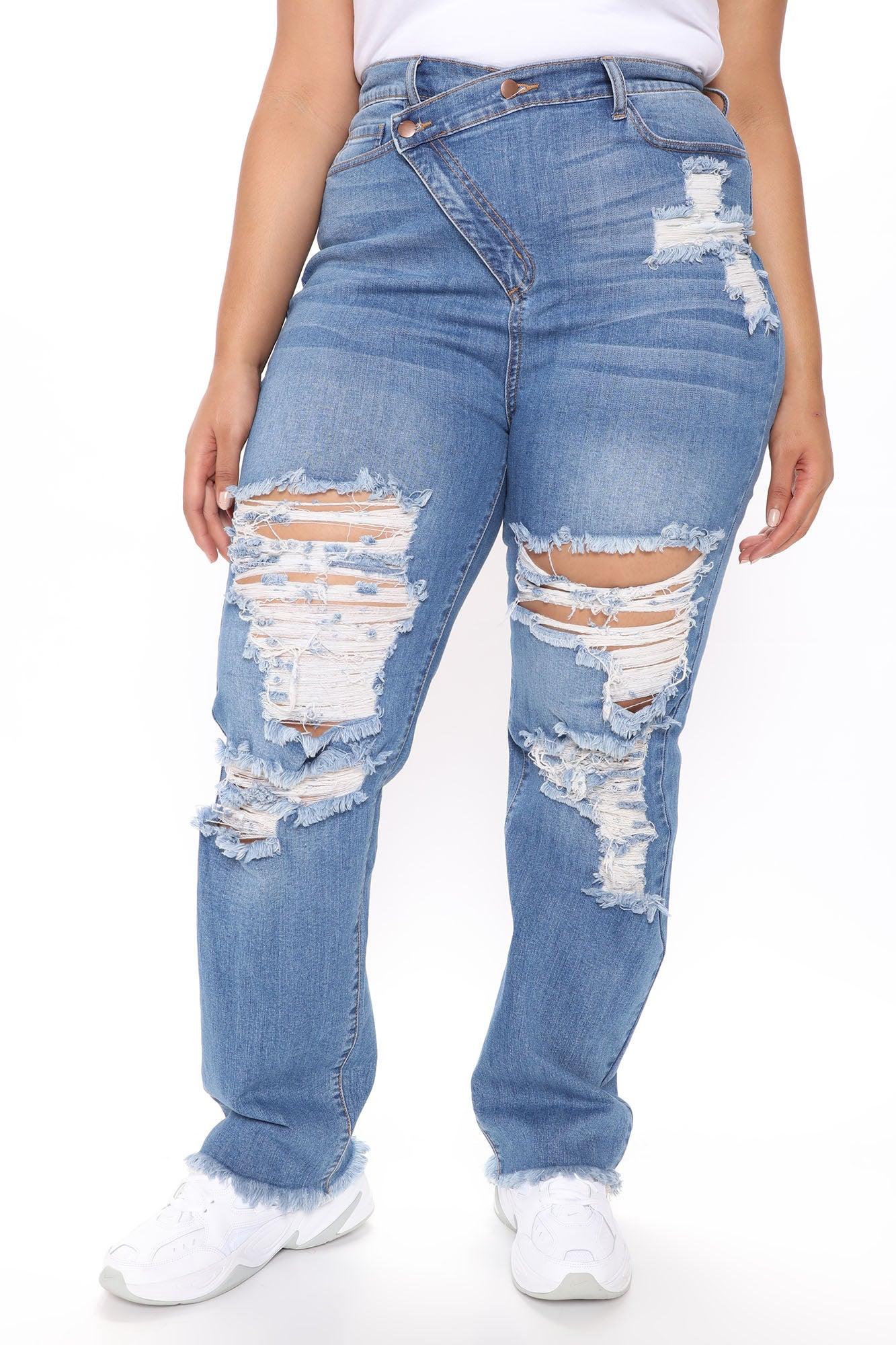 Available In Medium Blue Wash. Available In Petite 30" Inseam, Regular 33" Inseam, And Tall 37" Inseam Slouch Fit Jean Low Stretch Asymmetrical Waistband Ripped 5 Pocket Fray Hem 12.5" High Rise Disclaimer: Due To The Specialized Wash & Distressing Process, Each Garment Is Unique. 98% Cotton 2% Spandex Imported California Proposition 65WARNING: Cancer and Reproductive Harm - www.P65Warnings.ca.gov.