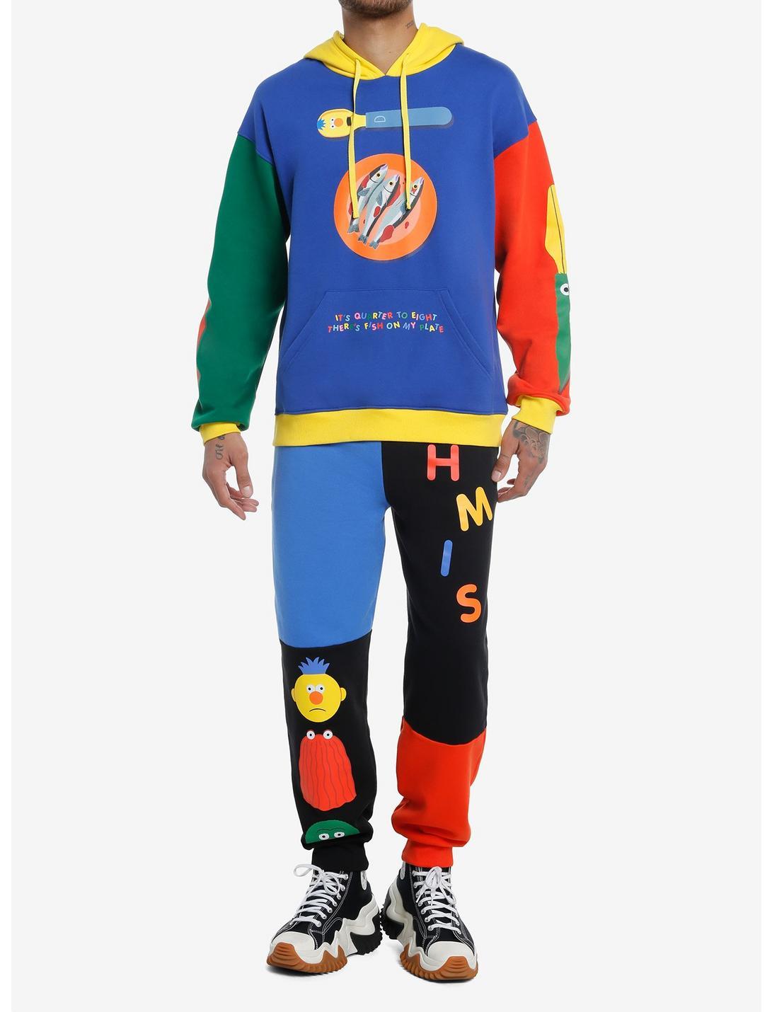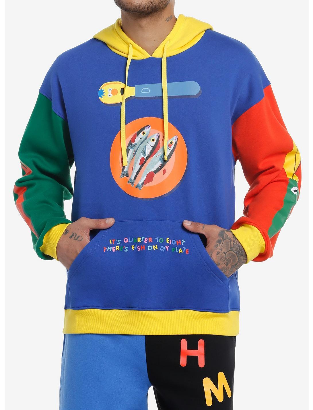Rep your fave show Don't Hug Me I'm Scared with this color-block hoodie. It features Red Guy, Yellow Guy and Duck as utensils on the sleeves and chest, with a plate of fish and text reading, "It's Quarter to Eight There's Fish On My Plate." Front kangaroo pocket and drawstring hood.60% cotton; 40% polyesterWash cold; dry lowImportedListed in men's/unisex sizesModel is 6'1"Model wears size Medium