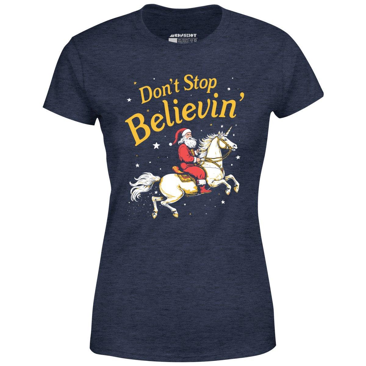 Don't Stop Believin'. A Christmas design featuring Santa Claus and Unicorn vibes. Printed on our super soft 100% ringspun & combed cotton women's T-Shirt. Or upgrade to our Luxury 52/48 cotton/poly vintage heather edition for an even softer classic look. We print & ship all of our high quality graphic tees in the USA.