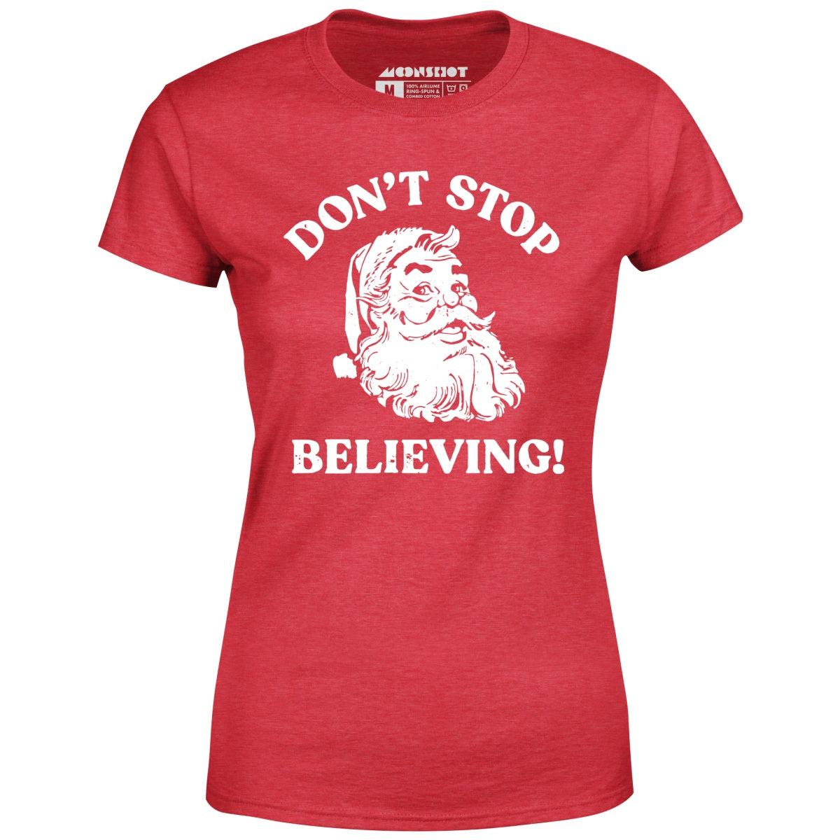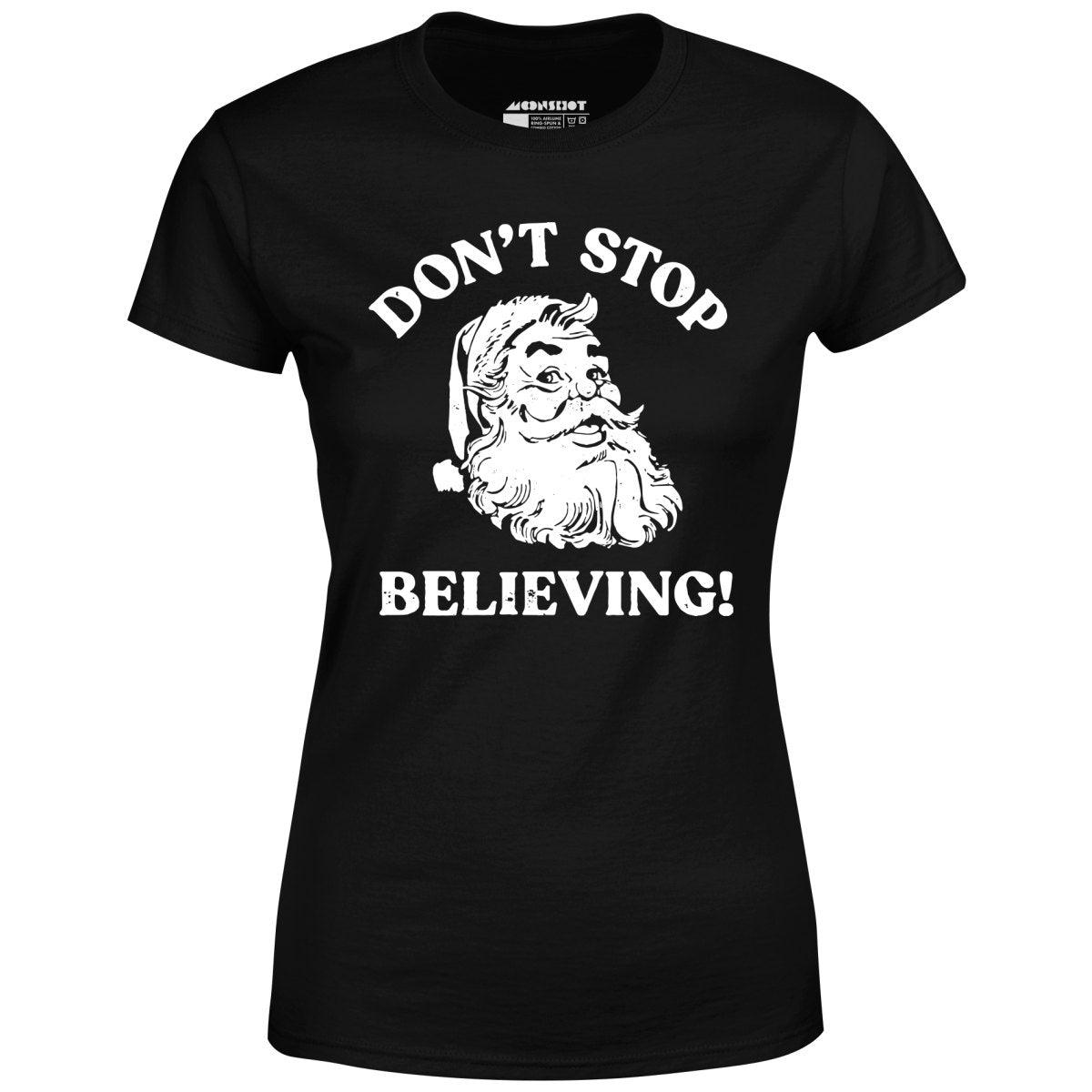 A Santa Claus inspired Christmas design. Don't stop believing in the big man! Inspired by the magic of Christmas. Printed on our super soft 100% ringspun & combed cotton women's T-Shirt. Or upgrade to our Luxury 52/48 cotton/poly vintage heather edition for an even softer classic look. We print & ship all of our high quality graphic tees in the USA.