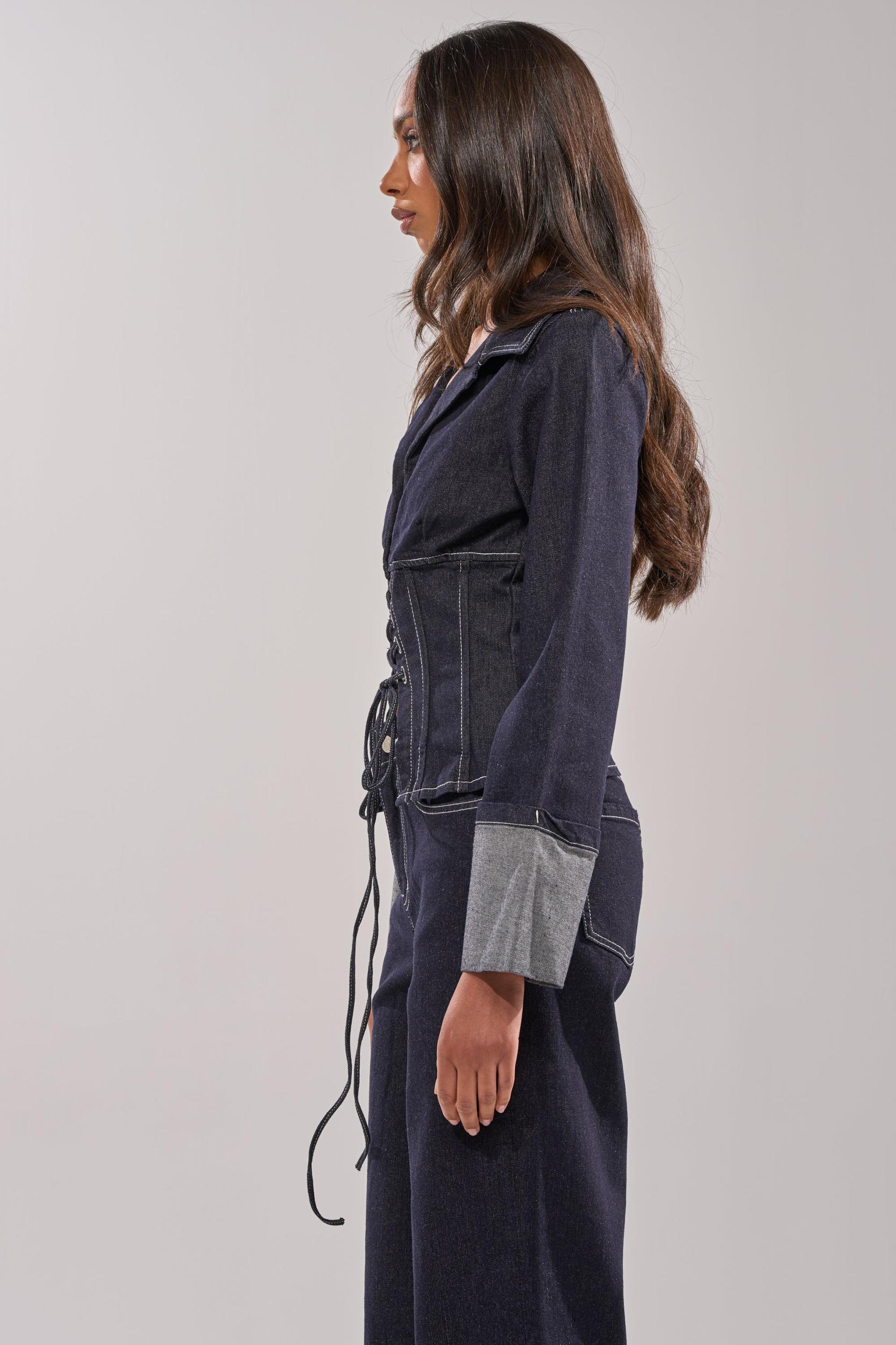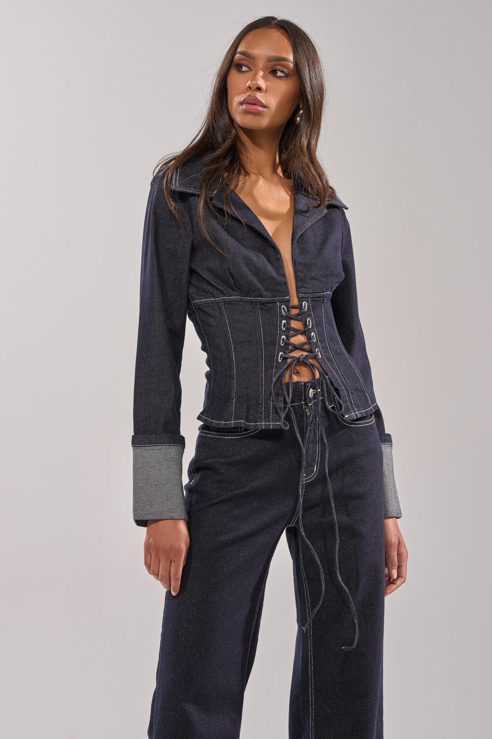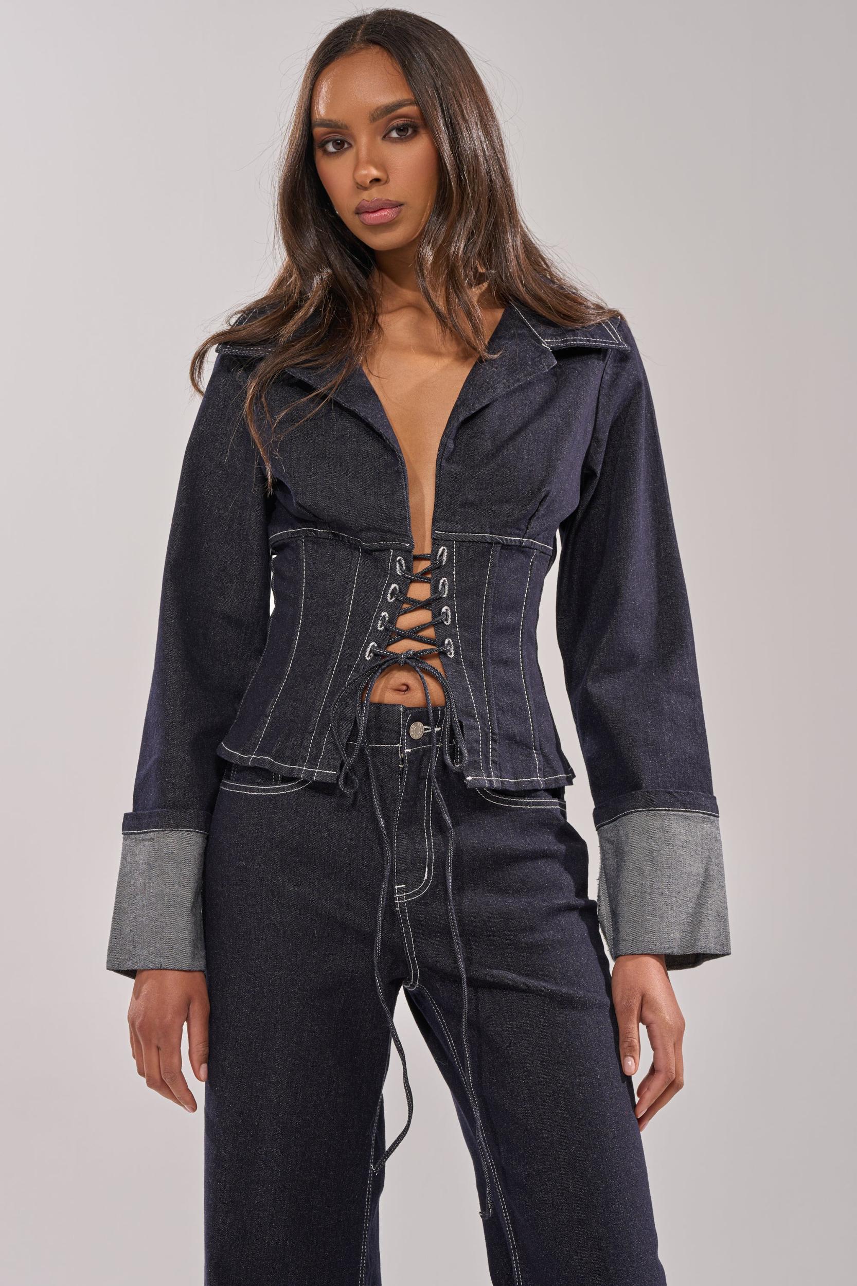 This chic dark-wash denim jacket is crafted from structured cotton denim and features a pointed collared neckline, long sleeves with cuffed hems, and contrast stitching for a tailored, elevated look. Designed with a corset-inspired lace-up front panel that cinches the waist for a flattering, sculpted silhouette, it blends classic denim with contemporary edge. Style it with the coordinating AKIRA Label Don’t Talk To Me Wide Leg Denim Jeans and stiletto booties for a bold denim-on-denim moment. - Shell: 85% Cotton 13% Polyester 2% Spandex- Slight Stretch- Imported (all measurements approximate from size small)- 21” Shoulder to Hem- 15” Shoulder to Shoulder- 25” Sleeves- Model is 5’10” and is wearing size smallProduct ID: 1076942 (all measurements approximate from size 1X)- 24” Shoulder to Hem- 19” Shoulder to Shoulder- 27” SleevesProduct ID: 1076946