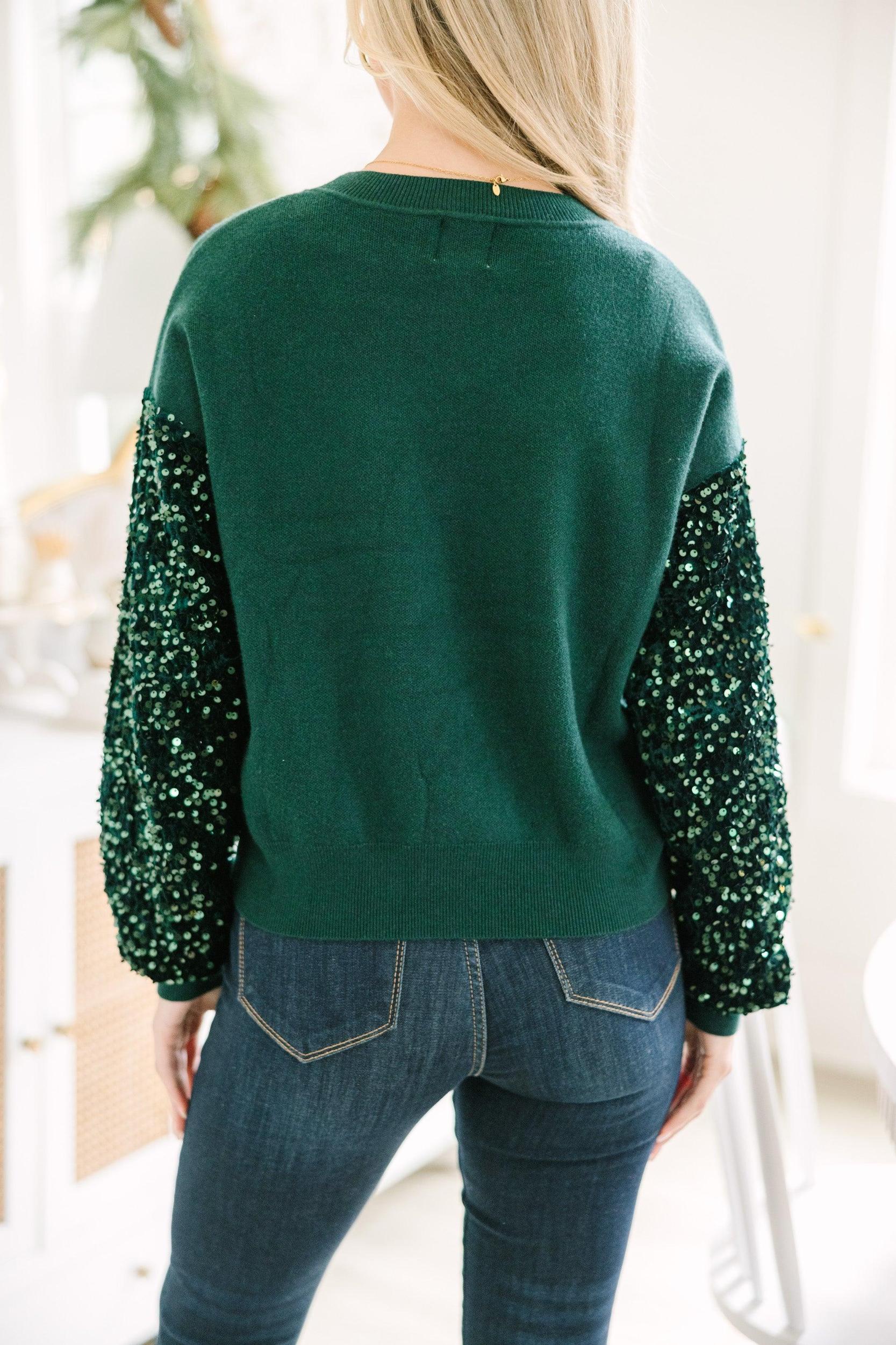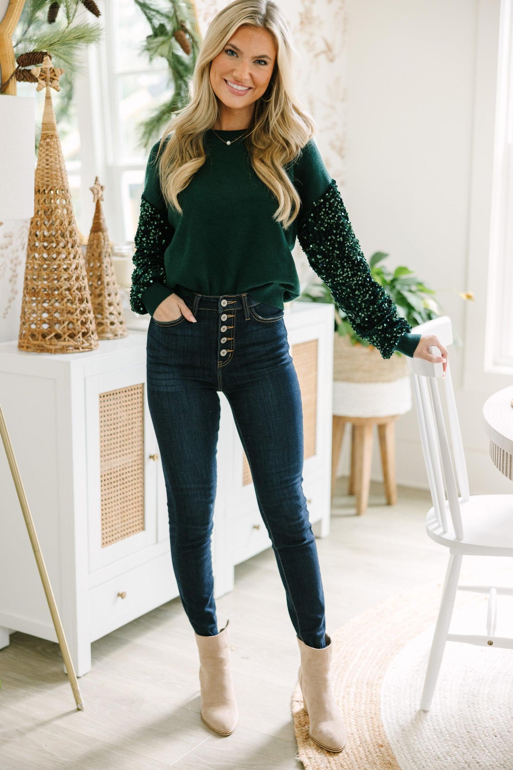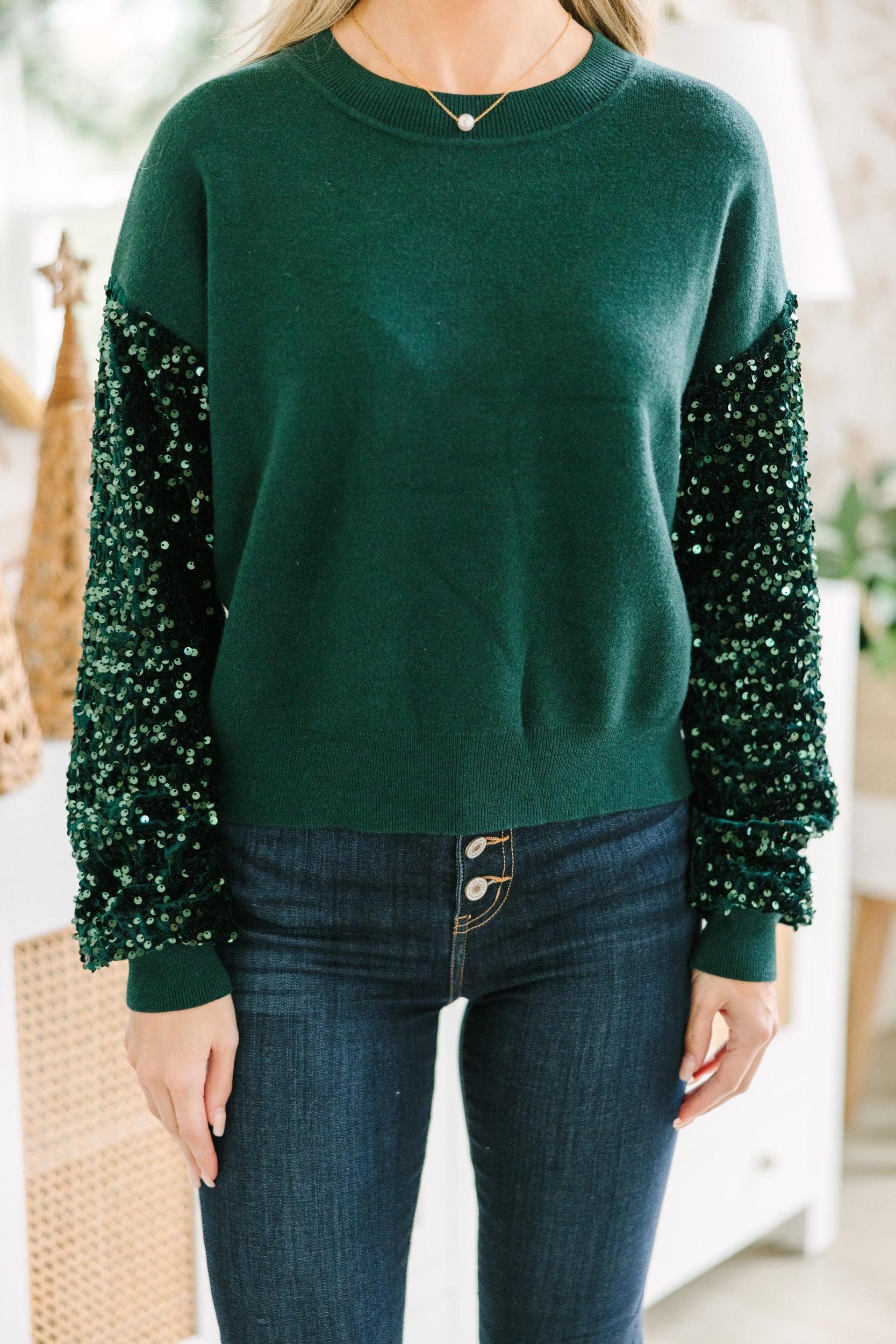 If you like this sweater then don't think twice about getting it! Because this one is going to go fast! Those velvet sleeves with all of those shimmering sequins are fabulous! The fabric is luxurious and we love pop of glam! This cozy sweater is just what you need for the holiday season! Round neckline Long sleeves with velvet fabric and sequins Drop Shoulders Knit body Generous stretch Baileigh is wearing the small.
