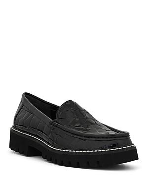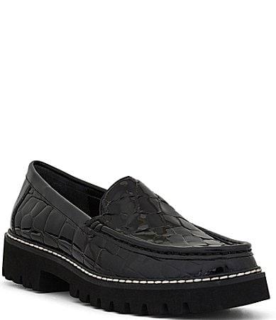 From Donald Pliner, the Hope Crocodile Embossed Patent Leather Lug Sole Platform Loafers feature:Crocodile embossed patent cow leather upper Slip-on styling Synthetic lining Memory foam sock lining EVA outsole Contrasting stitching detail on weltApprox. 0.75 platform height Approx. 1.5 heel height Imported.
