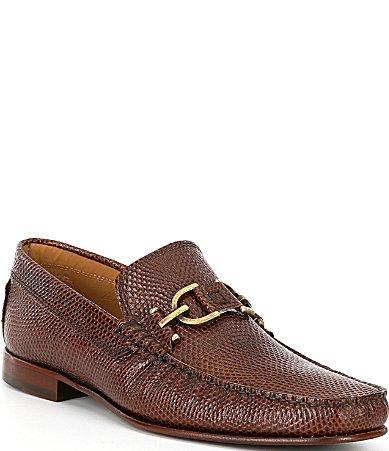 From Donald Pliner, the Mens Dacio Lizard Print Bit Loafers feature:Lizard print leather upperSignature D bitContrast stitching detailLeather liningMemory foam sock liningRubber pod insert with durable leather outsole with leather stacked heelMade in Italy.Imported.