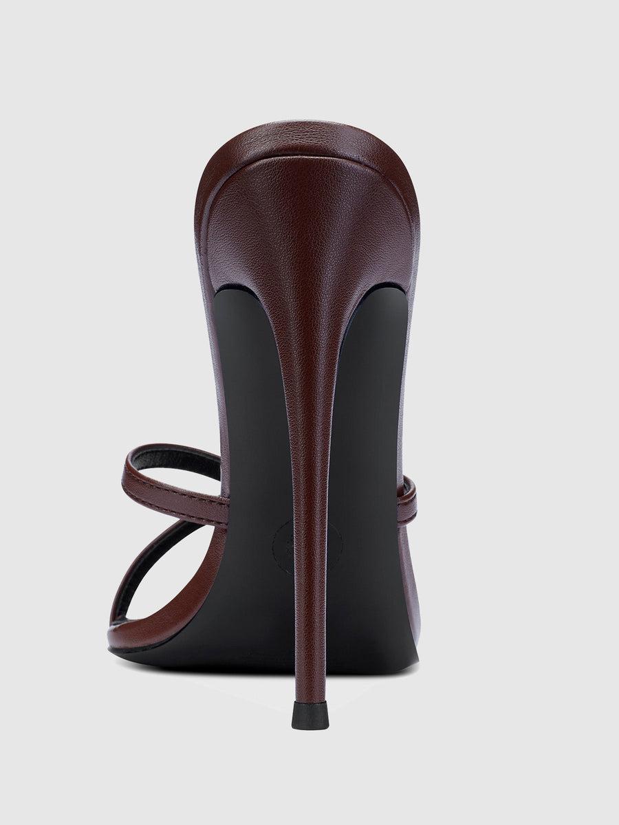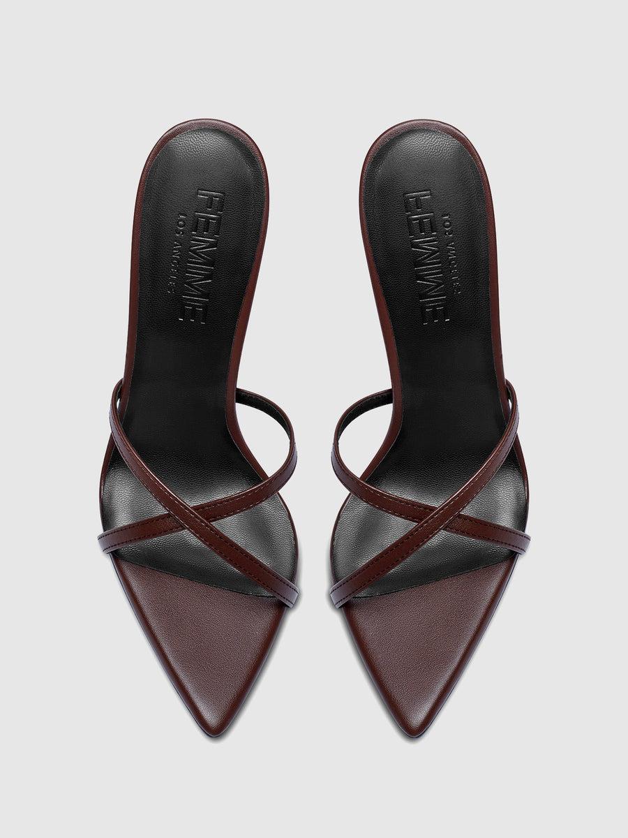 The Donatella Mule features a sleek criss-cross design with minimal straps and a slip-on detail. Its signature spiked stiletto heel adds a touch of edginess and makes it a versatile choice for both day and night wear. Vegan upperVegan insoleVegan outsoleOpen pointed toeSlip-onHandmadeDesigned in LA Self-covered stiletto heel, 4.75" (120mm)