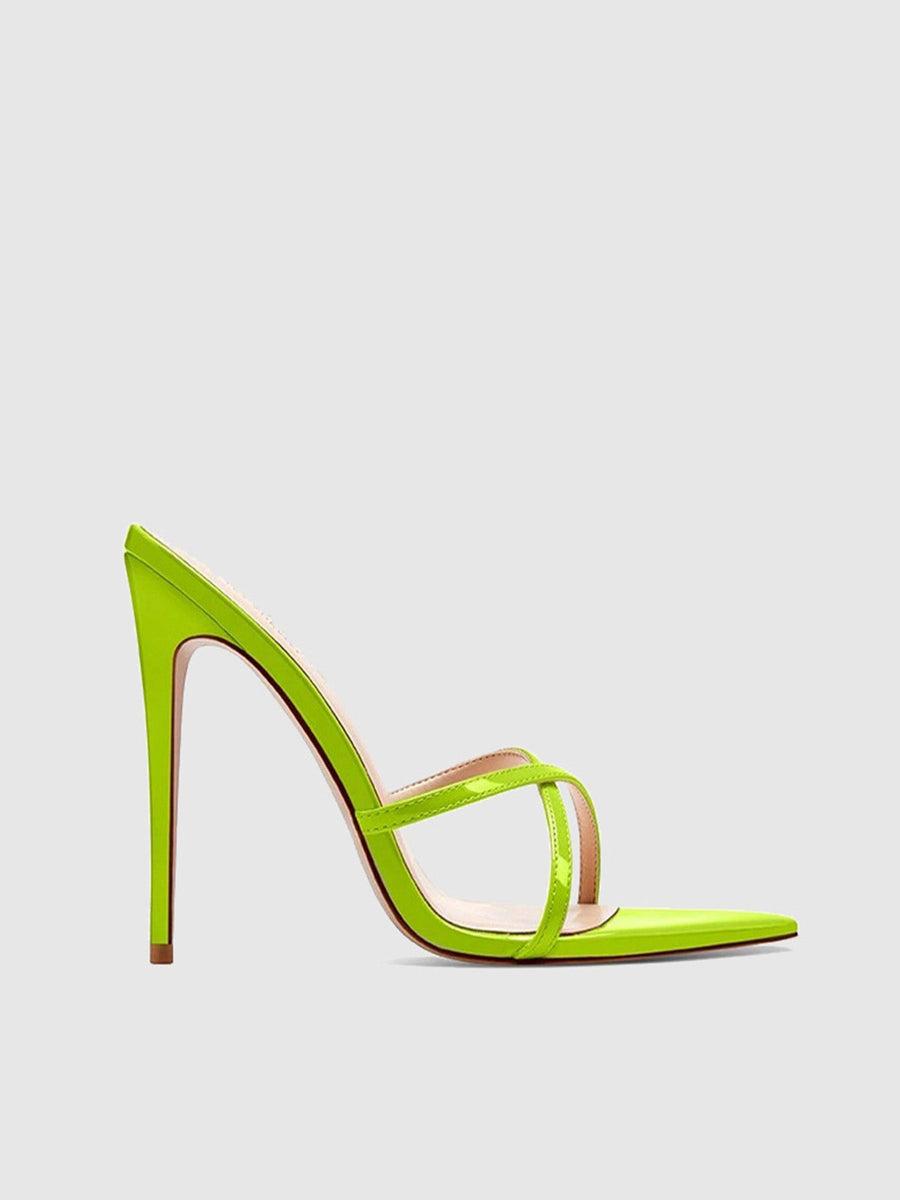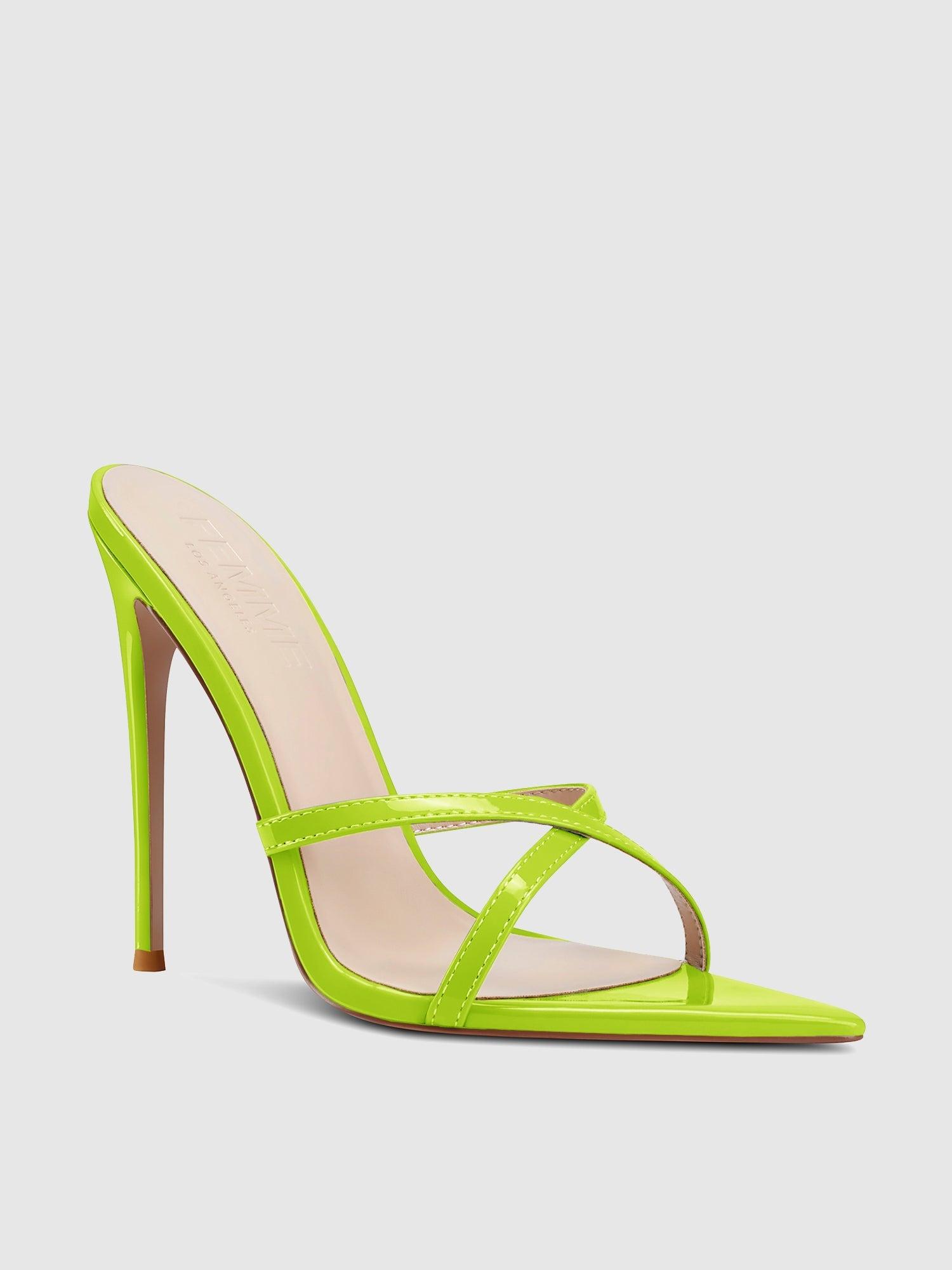 The item is a final sale product. This item is sold "as-is" and is not eligible for returns or exchanges. Please reach out to us regarding sizing questions or any inquiries.The Donatella Mule features a sleek criss-cross design with minimal straps and a slip-on detail. Its signature spiked stiletto heel adds a touch of edginess and makes it a versatile choice for both day and night wear. Vegan upperVegan insoleVegan outsoleOpen pointed toeSlip-onHandmadeDesigned in LA Self-covered stiletto heel, 4.75" (120mm)