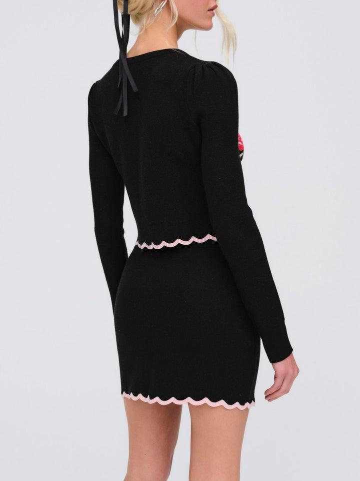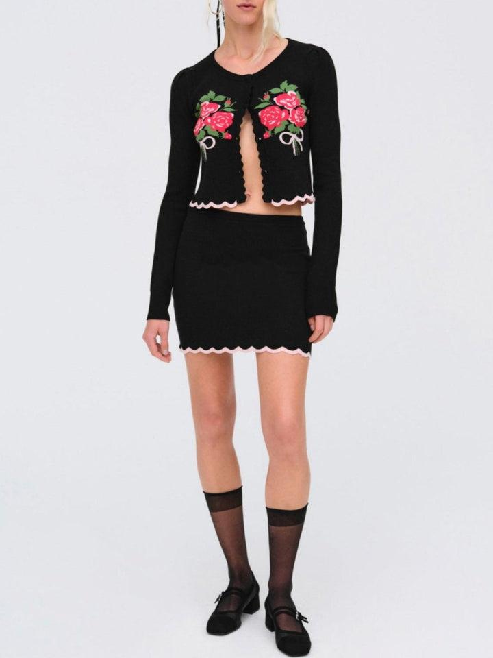 Cherish the art of dressing up with the Donella black cardigan—a knit cardigan with functional buttons and an ultra-charming rose bouquet design that exudes femininity. Pair this cropped cardi with the matching Donella Knit Mini Skirt for a co-ord set.