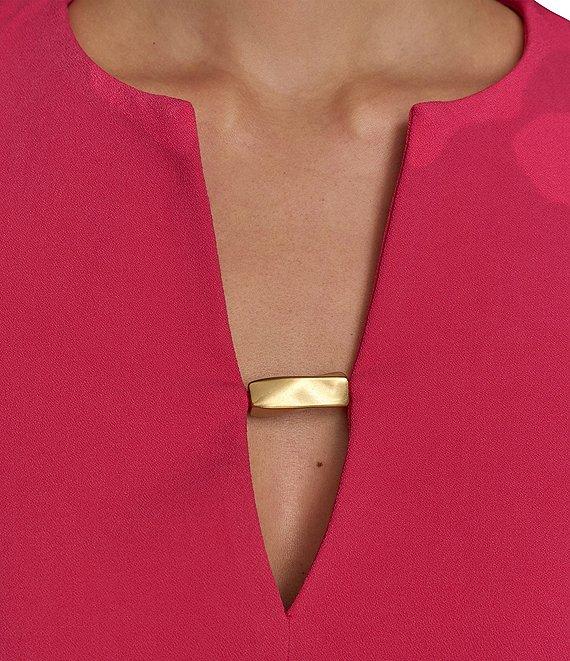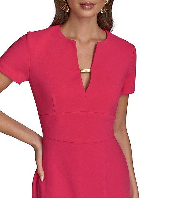 From Donna Karan, this dress features: Cady crepe fabrication Split v-neckline Short sleeves Sheath silhouette Zipper back closure Gold hardware detailing at neckline Approx. 40.5" in length Polyester/rayon/spandex Dry clean Imported.