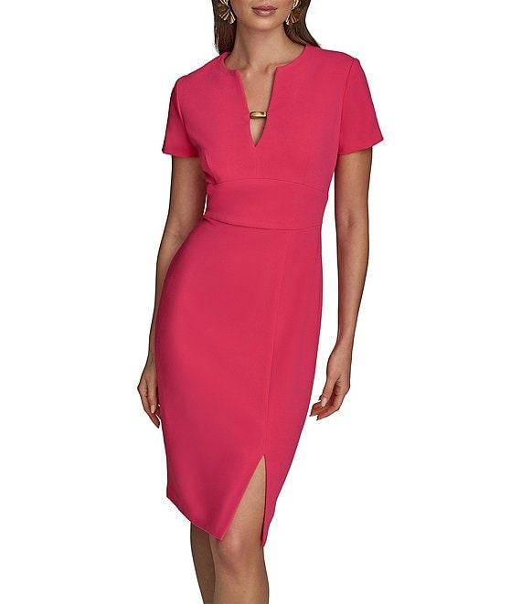 Donna Karan Cady Crepe Split V-Neck Short Sleeve Sheath Midi Dress