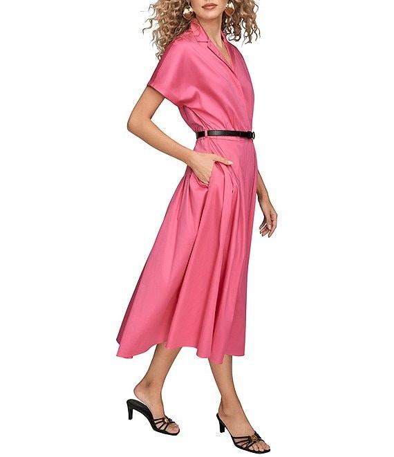 From Donna Karan, this dress features: Cotton sateen fabrication Shirt dress silhouette Notch collar neckline Short sleeves Belt with gold buckle hardware Side seam pockets Button front placket closure Approx. 48" center back length Cotton/elastane/spandex Machine wash cold/line dry Imported.