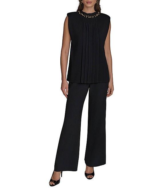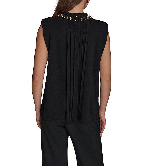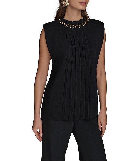 Donna Karan Crew Neck Beaded Collar Pleated Sweater