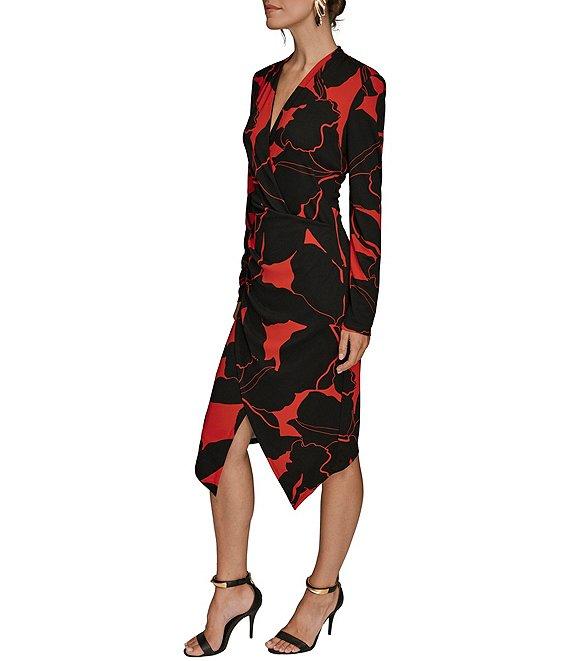 From Donna Karan, this dress features: Filament jersey fabrication Wrap v-neckline Long sleeves Floral print Faux wrap silhouette High low skirt hem Center back zipper closure Approx. 40.5" in length Polyester Dry clean Imported.