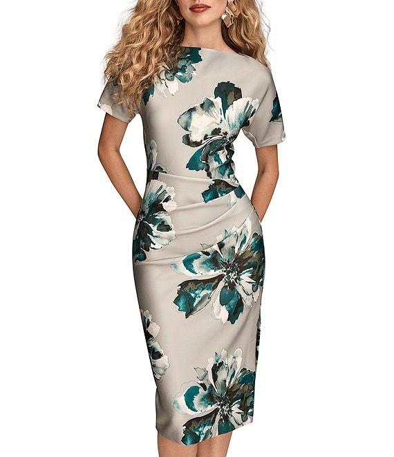 From Donna Karan, this dress features: Lightweight scuba fabrication Boat neckline Short sleeves Floral print Ruched gathering on side bodice Skirt slit Approx. 43" in length Polyester/spandex Dry clean Imported.