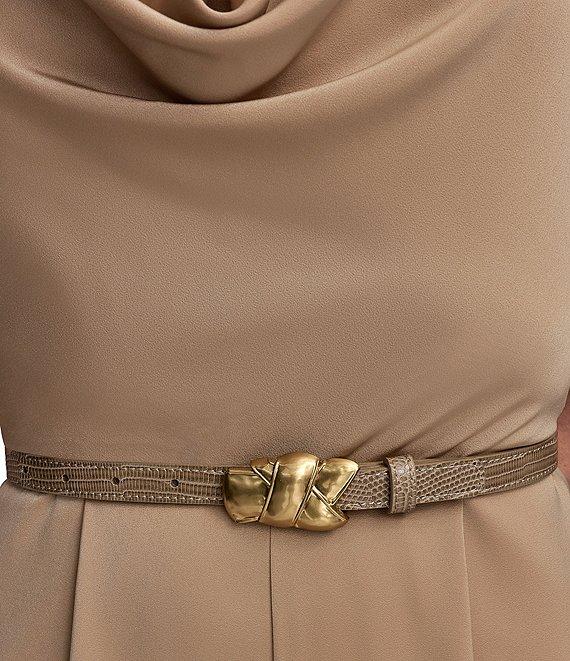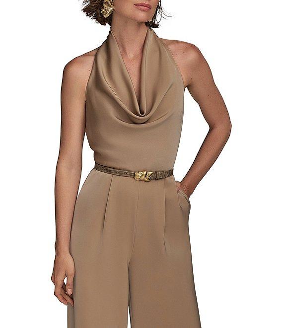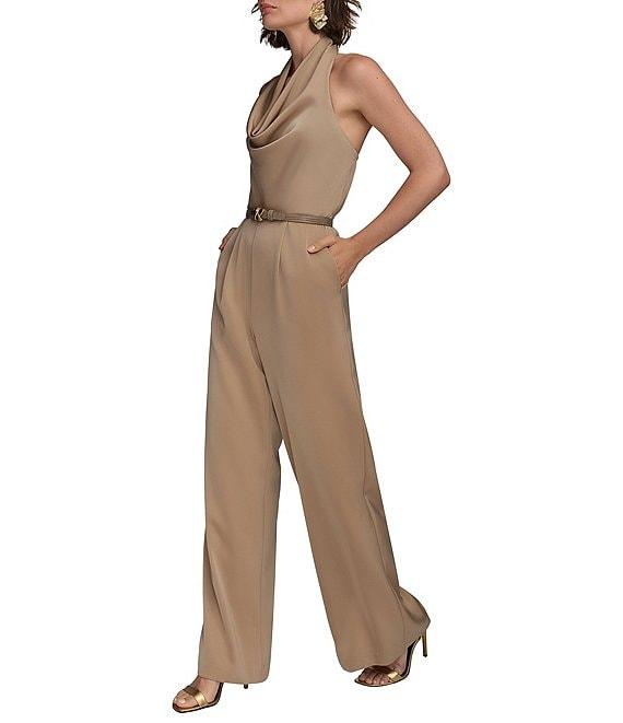 From Donna Karan, this jumpsuit features: Satin fabrication Halter cowl neckline Sleeveless Lined Pockets Attached belt Zip back closure Approx. 32" inseam Polyester/spandex Dry clean Imported.