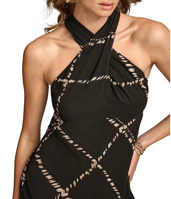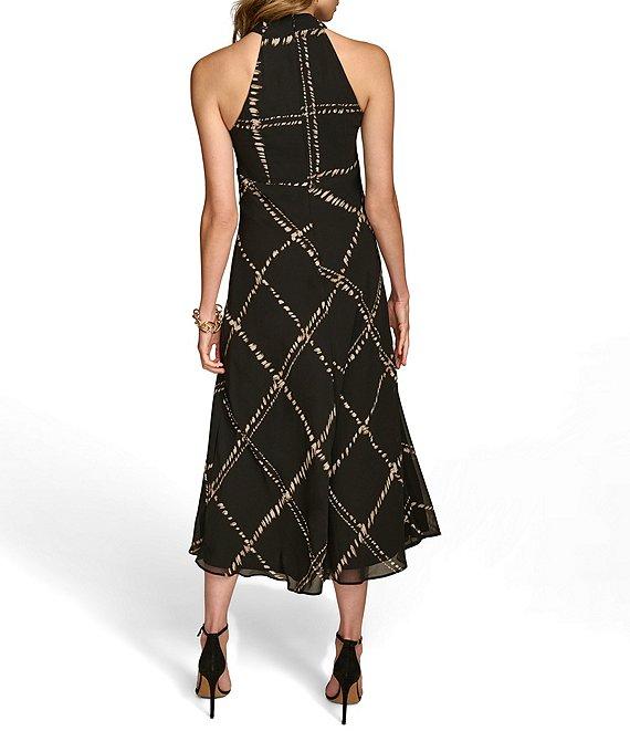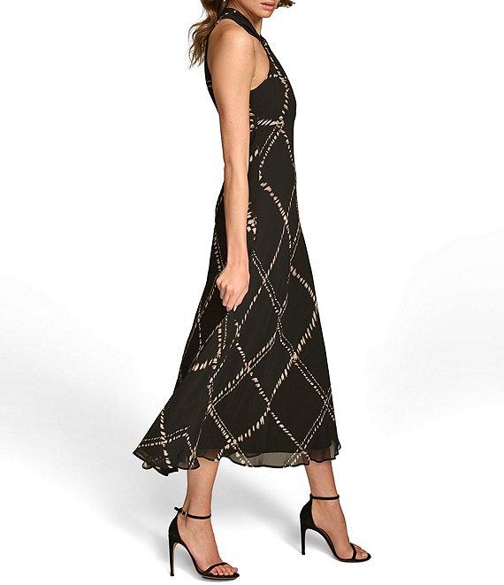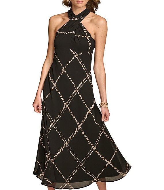 From Donna Karan, this dress features: Chiffon fabrication Halter neckline Sleeveless Slip silhouette Lined Print Zip back closure Approx. 51" in center back length Polyester Dry clean Imported.