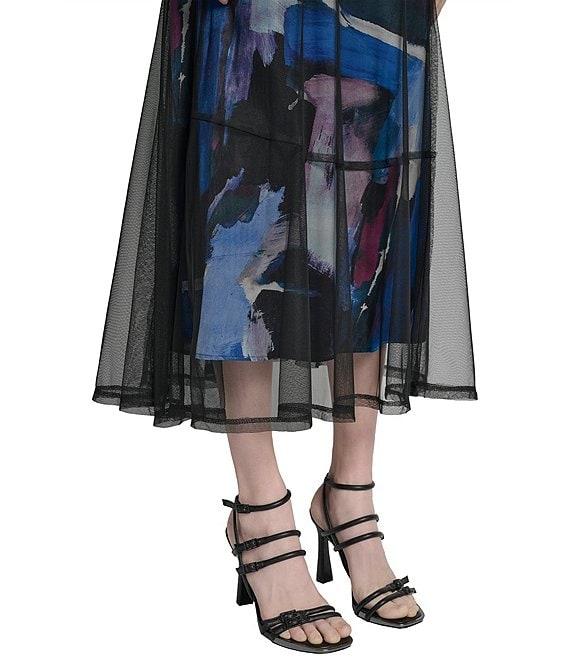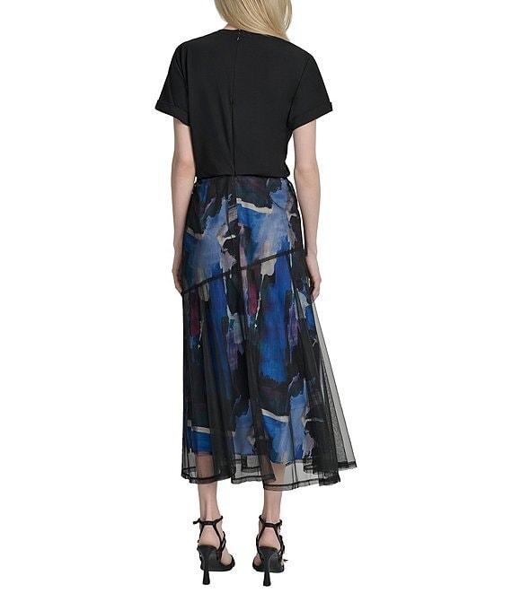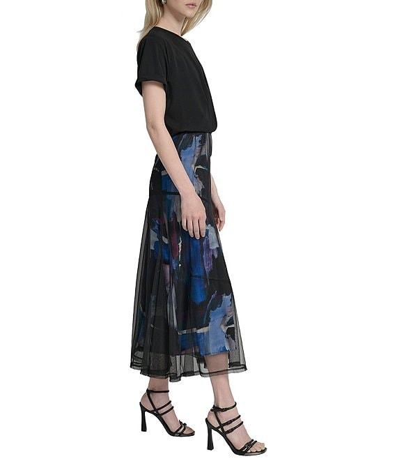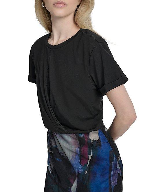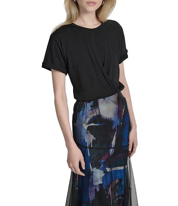 From Donna Karan, this dress features: Mix media fabrication Crew neckline Short sleeves Twist front detail Mesh overlay skirt Zip back closure Approx. 53" HPS Viscose rayon/nylon/elastane/spandex Machine wash cold/line dry Imported.