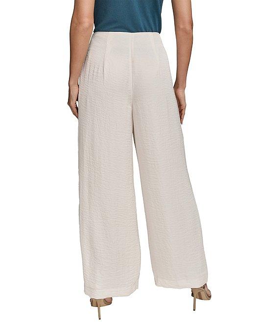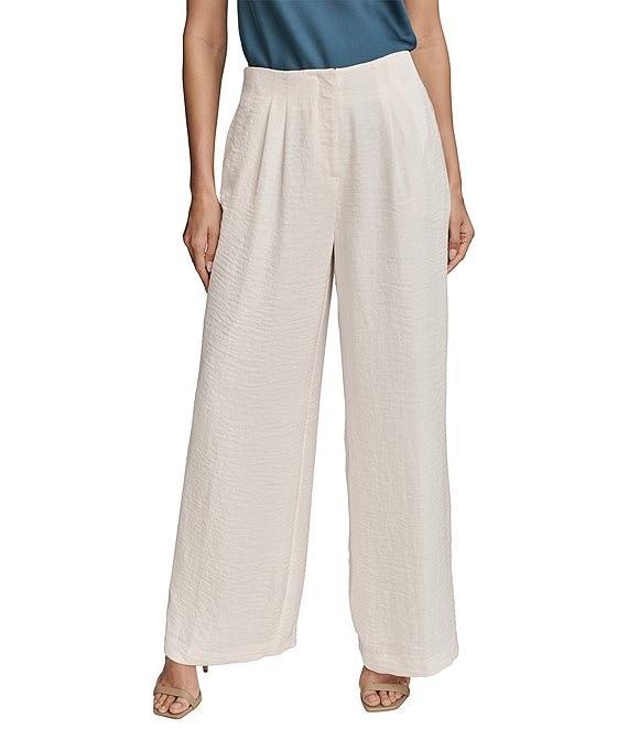 From Donna Karan, these pants feature: Pleat front silhouette Ripple fabrication Front functional seam pockets Wide leg Front zipper and hook closure Approx. 32" inseam Polyester Machine wash cold/flat dry or dry clean Imported.