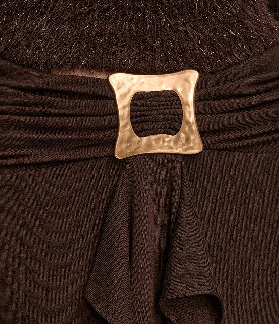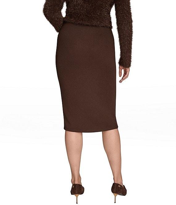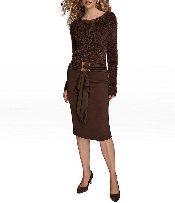 From Donna Karan, this skirt features: Faux wool effect jersey fabrication Pencil silhouette Ruched waist with cascade ruffle detail Buckle embellished Lined Pull-on construction Approx. 27.25" length Polyester/elastane/spandex: lining; polyester Hand wash cold/ line dry Imported.