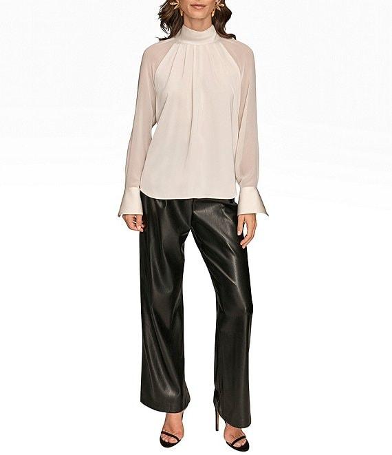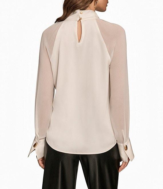 From Donna Karan, this blouse features: Satin back crepe fabrication Mock neck Sheer long sleeves Hardware at cuffs Back keyhole button closure Approx. 23.5" length Polyester Machine wash cold/line dry Imported.