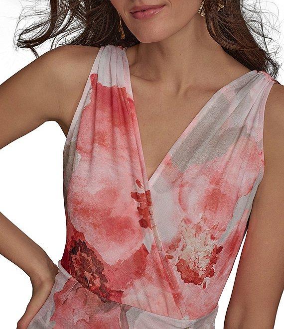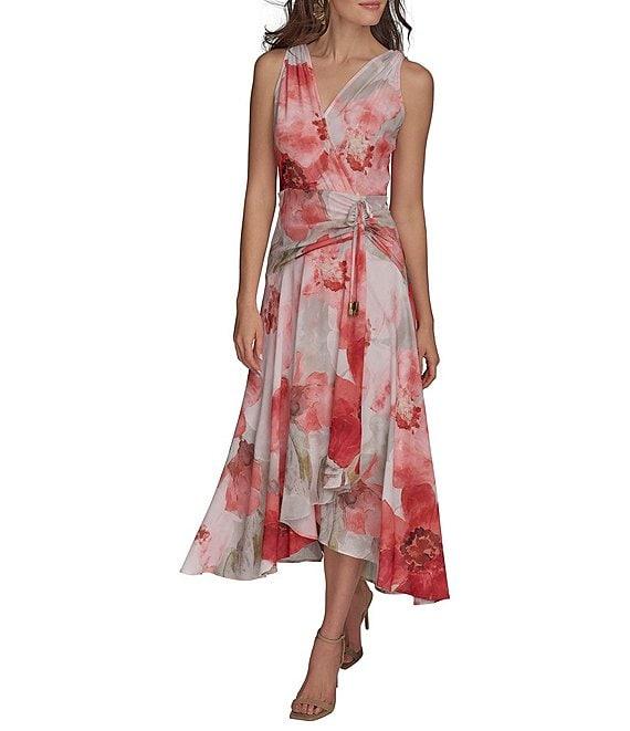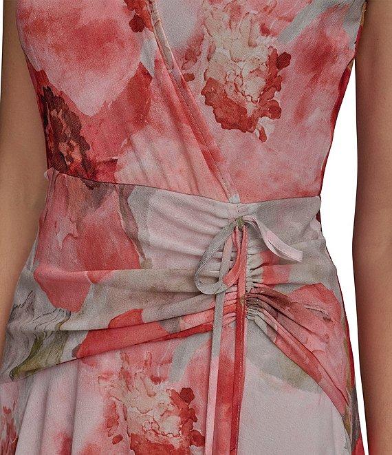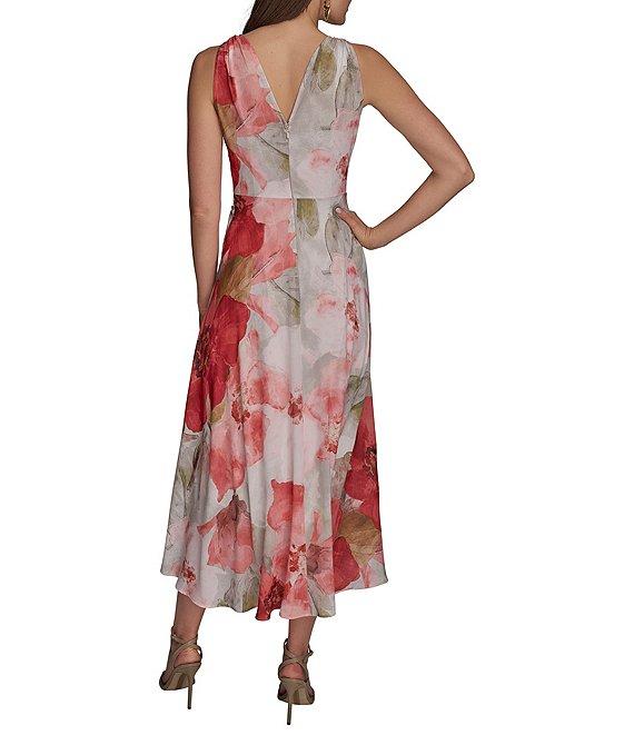 Donna Karan V-Neck Floral Print Sleeveless Chiffon Wrap Midi Dress