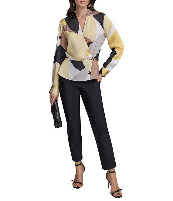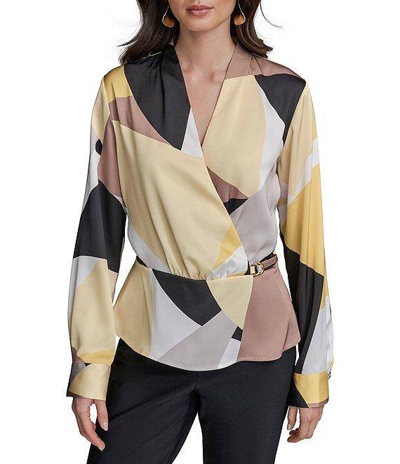 From Donna Karan, this blouse features: Woven fabrication Print design V-neckline Long sleeves with cuffs Faux wrap with side double gold tone hardware Front top snap Pullover closure Approx. 23" center back Partially lined Polyester Dry clean only Imported.
