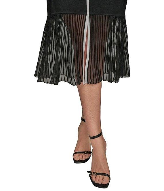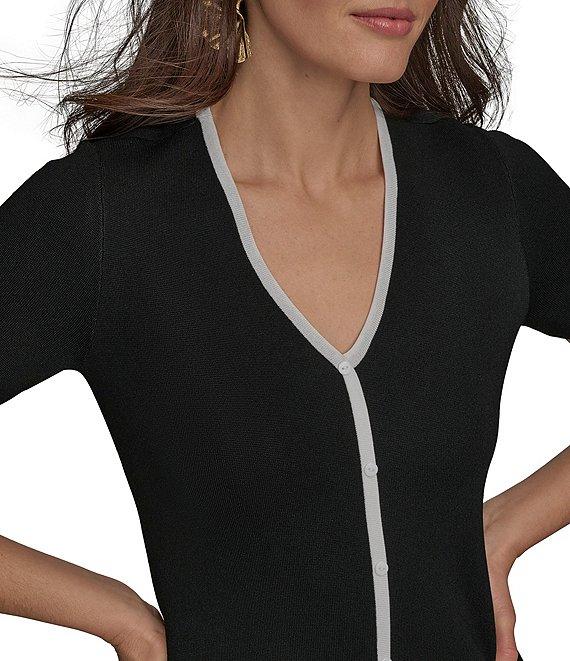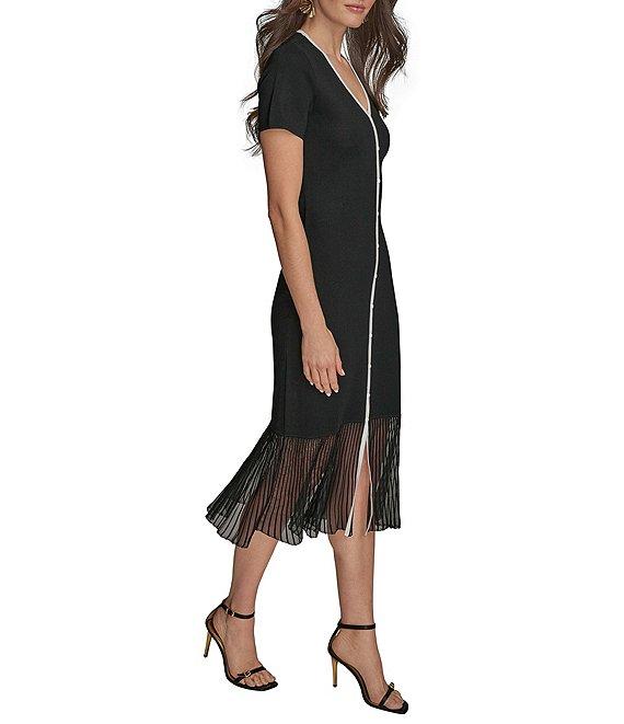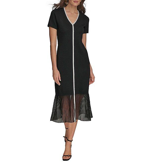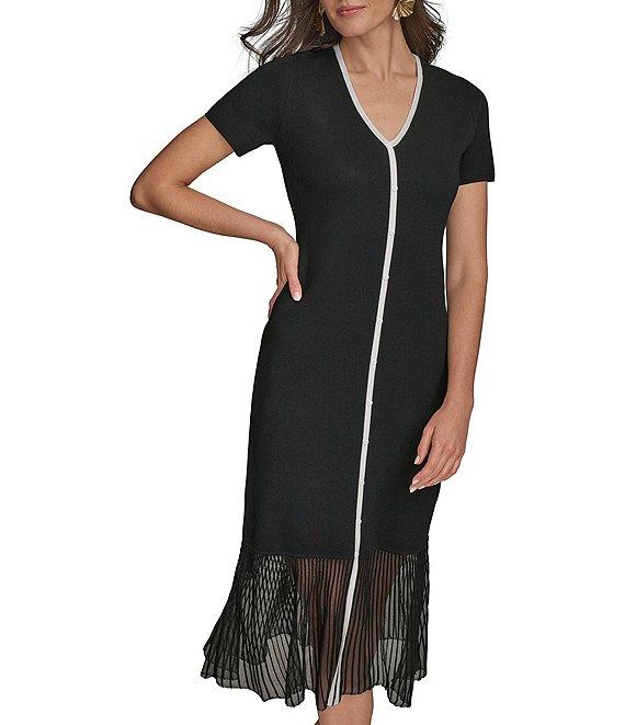 From Donna Karan, this dress features: Knit and sheer knit fabrication V-neckline Short sleeves Sheath silhouette Contrast trim Button front closure Approx. 47" in length Rayon/nylon/polyester Machine wash/dry flat Imported.