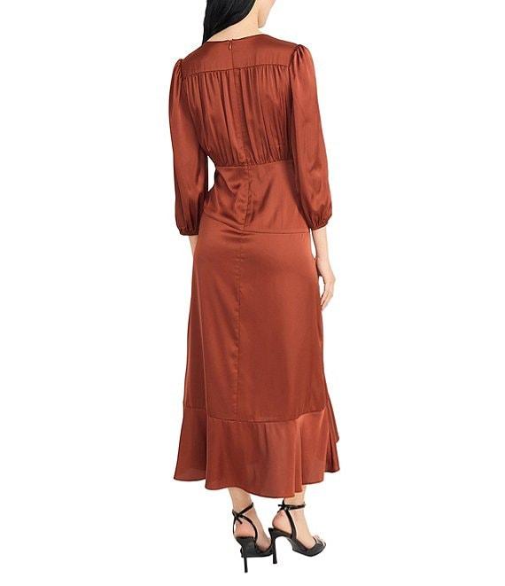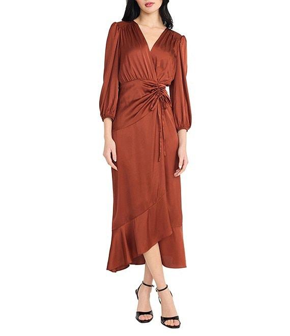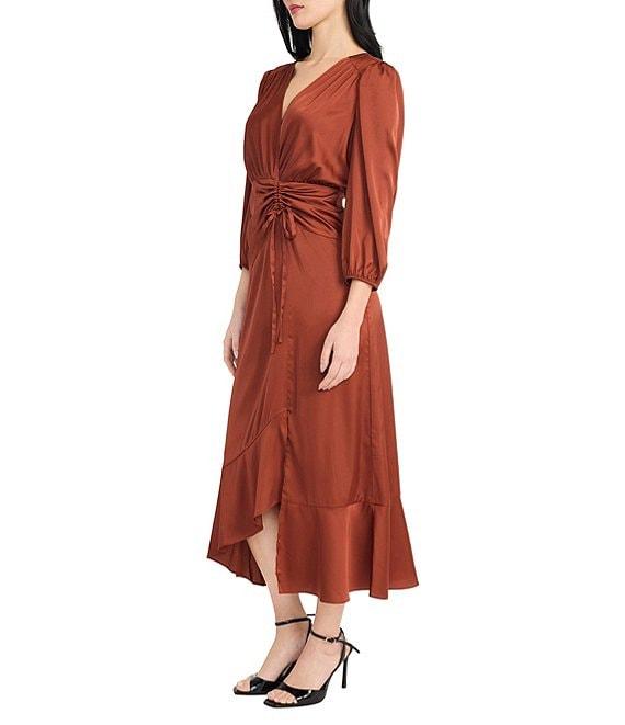 From Donna Morgan, this dress features: Light charmeuse fabrication V-neckline 3/4 sleeves Puff sleeve Wrap dress Wrap sash extended from side seams Tiered skirt High low skirt hem Lined Center back zipper closure Approx. 50.75" in length from center back neck to hem Polyester/spandex Dry clean Imported.
