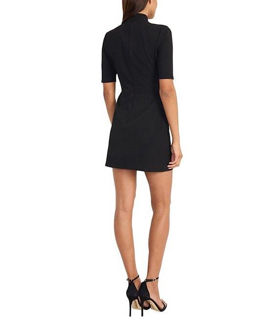 From Donna Morgan, this dress features: Scuba crepe fabrication Mock neckline Elbow sleeves Lined Sheath silhouette Button detail Center back zipper closure Approx. 33.5" in length from neck to hem Polyester/spandex Dry clean/machine wash cold Imported.
