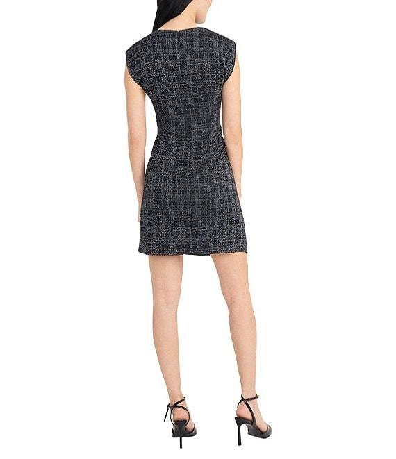 Donna Morgan Plaid Boucle Tweed Crew Neck Gathered Sleeveless Mini Dress