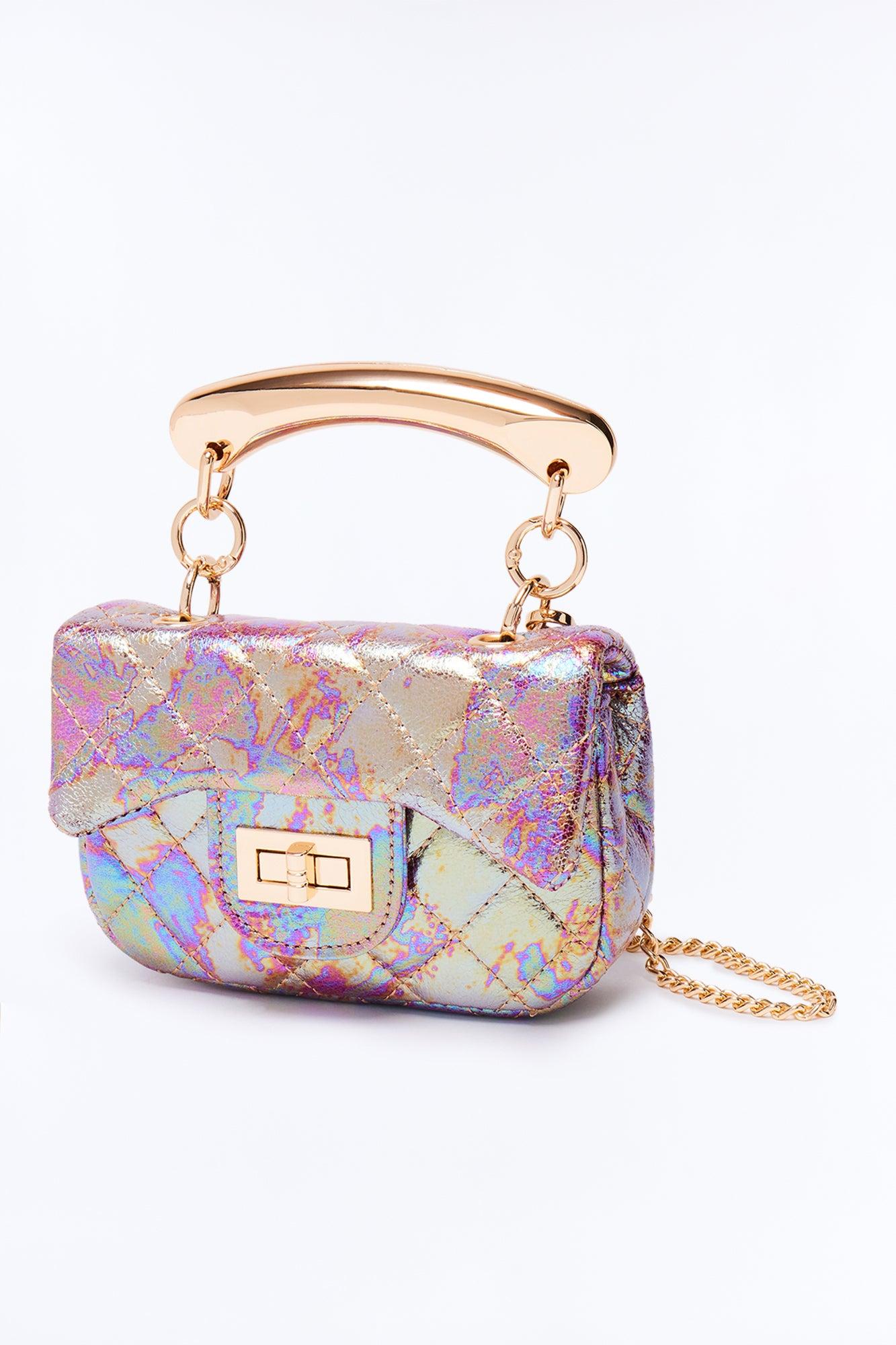 Available In Multi Color. Mini Satchel Bag Foldover Closure Faux Leather Material Quilted Pattern Metallic Metal Handle Detail 6"W 2"H 4.5"D Imported California Proposition 65WARNING: Cancer and Reproductive Harm - www.P65Warnings.ca.gov.