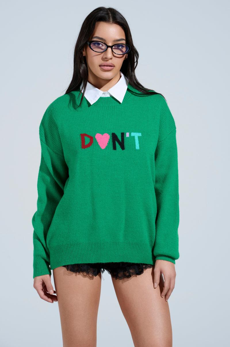 Watch out, haters, when you rock The AKIRA Label Don’t Do It Sweater. This cheeky piece is made from a cozy knit material and features ribbed knit hemlines, a classic crew neck, long sleeves with cinched cuffs, and a coordinating waistband. The chest boasts a vibrant “DON’T” graphic, while the back carries the cheeky message, “Don’t F*ck With My Feelings.” Complete with an oversized, pull-on fit. Style with baggy jeans and platform sneakers for a sassy finish. - 70% Polyester 30% Nylon- Hand Wash Cold- Stretchy- Imported (all measurements approximate from size O/S)- 26” Shoulder to Hem- 24” Shoulder to Shoulder- 21” Sleeves- Model is 5’7” and is wearing size O/S Product ID: 1038939
