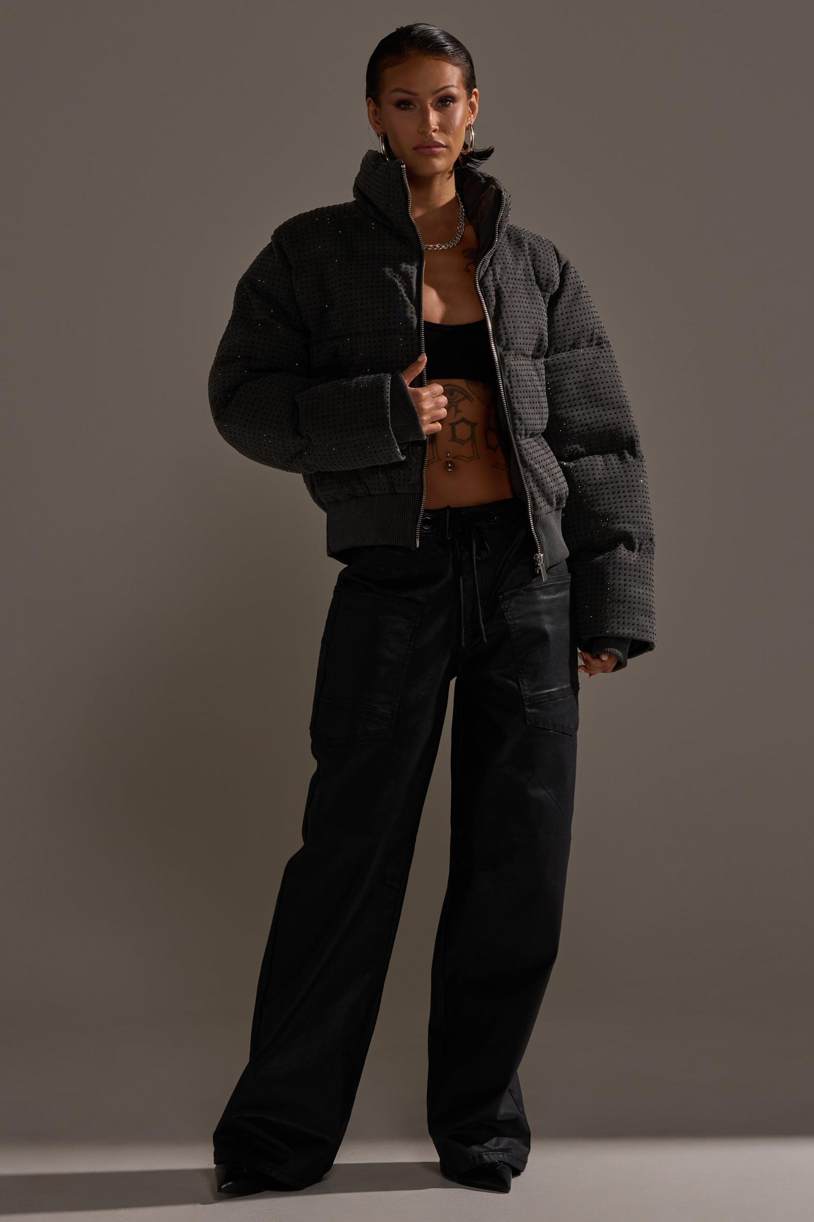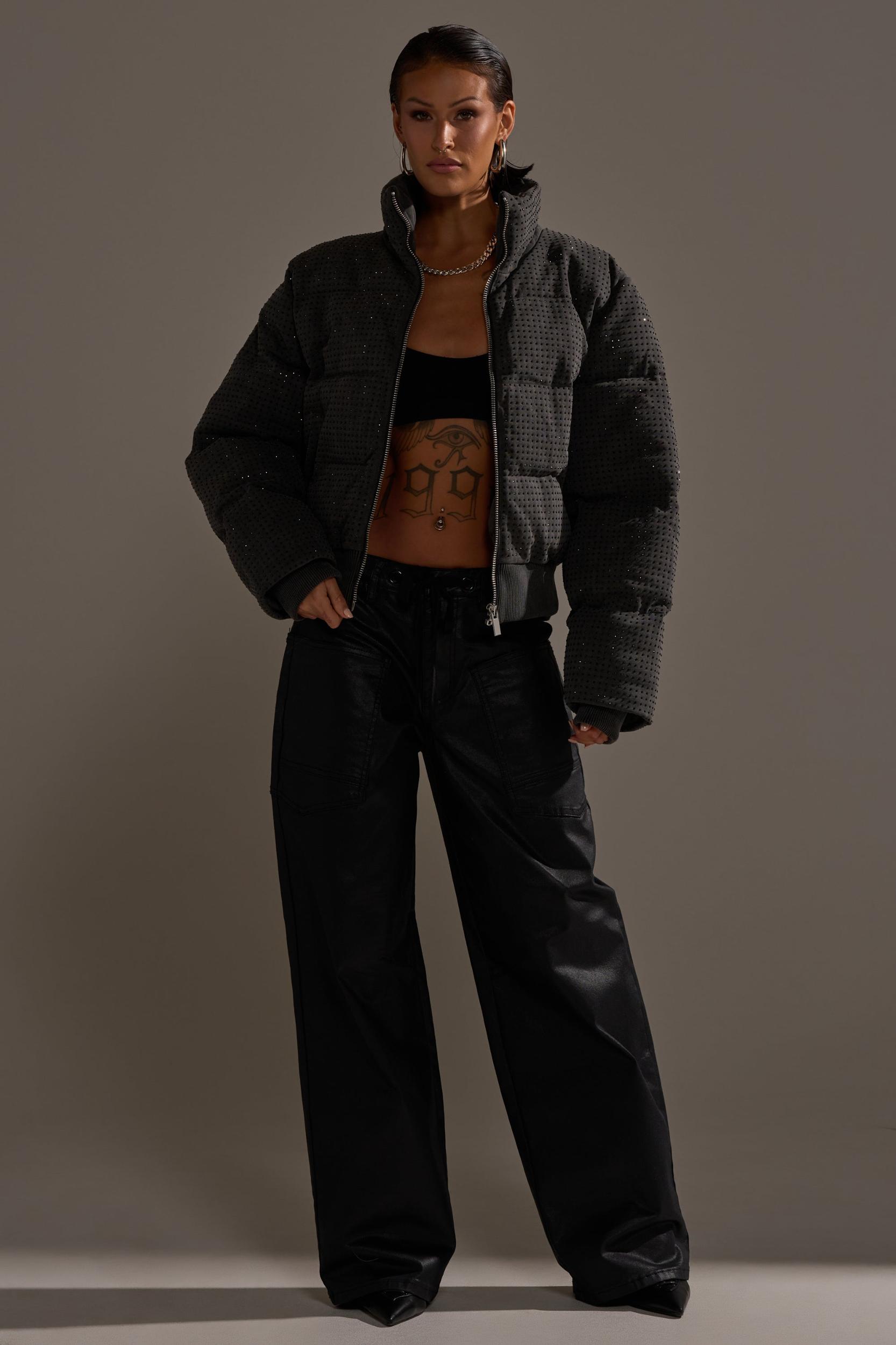 Edgier than your average jeans, The AKIRA Label Don’t Give Up Coated Wide-Leg Denim is crafted from a sleek, stretchy coated fabric with a subtle, inky sheen. They feature oversized front and back patch pockets, an adjustable drawstring waist with grommet details, and a high-rise, wide-leg silhouette. The waxed finish gives them a modern, street-style edge that transitions from day to night with ease. Complete with functional belt loops and a zip-button front closure. - 33% Cotton, 32% Rayon, 32% Polyester, 3% Spandex- Spot Clean Only- Some Stretch- Imported (all measurements approximate from size small)- 11” Rise- 31” InseamProduct ID: 1062988 (all measurements approximate from size 1X)- 13” Rise- 32” InseamProduct ID: 1062992
