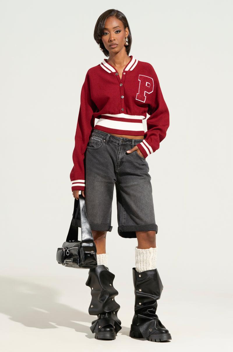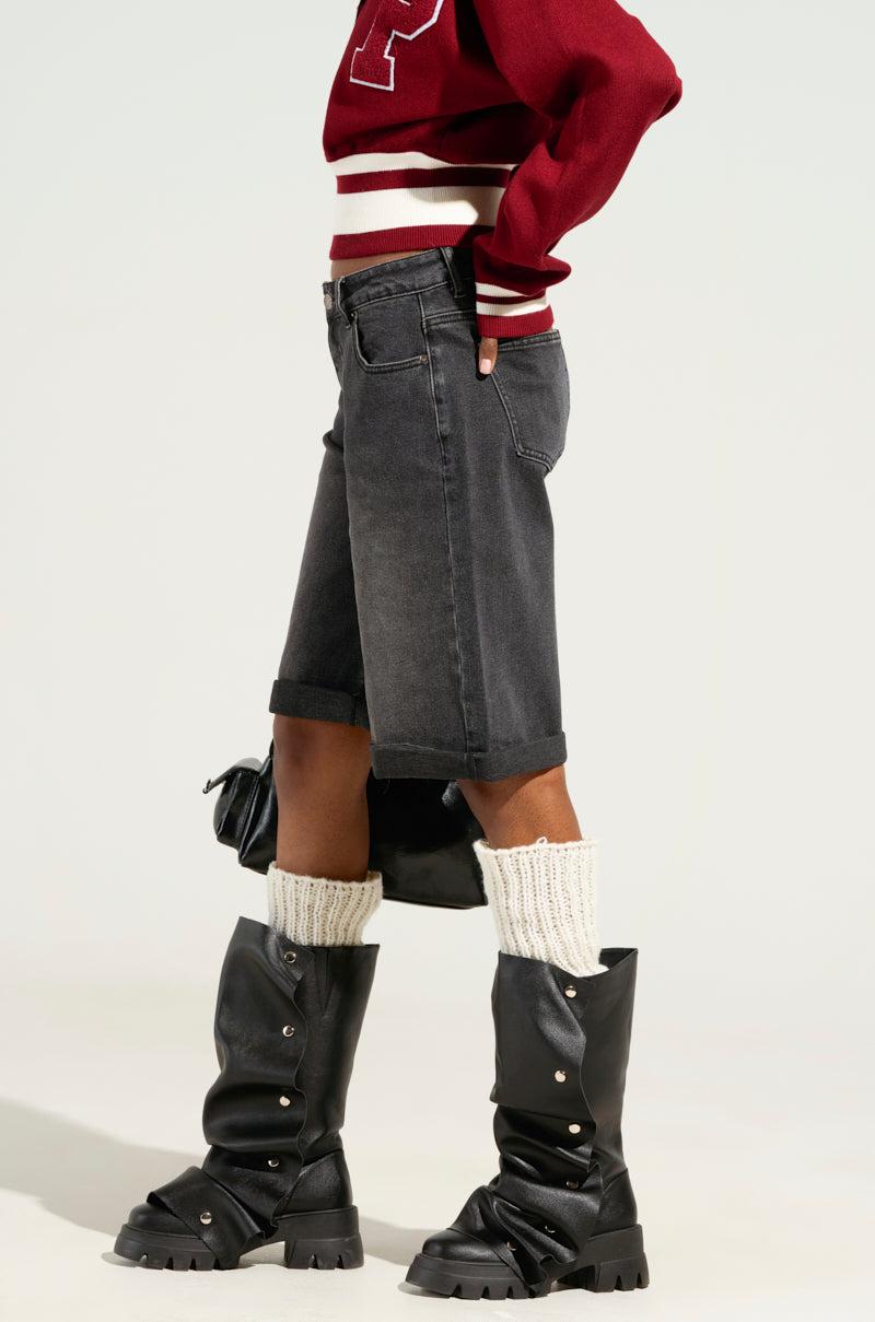 Staying in your lane and mindin’ your own business. The AKIRA Label Don’t Know Don’t Care Bermuda Short is crafted from stretchy black denim and features a mid-rise, wide-leg fit, a knee-length silhouette, a classic five-pocket design, standard zip-button closure, and functional belt loops. Complete with cuffed hems and a petite “don’t know don’t care” embroidery on the front right pocket to remind everyone that you’re soo over it. - 68% Cotton, 31% Polyester, 1% Spandex- Some Stretch- Imported (all measurements approximate from size small) - 21” Waist to Hem- 10.5” Inseam - 10.5” RiseProduct ID: 440574 (all measurements approximate from size 1X)- 22” Waist to Hem- 10” Inseam- 12” RiseProduct ID: 440578