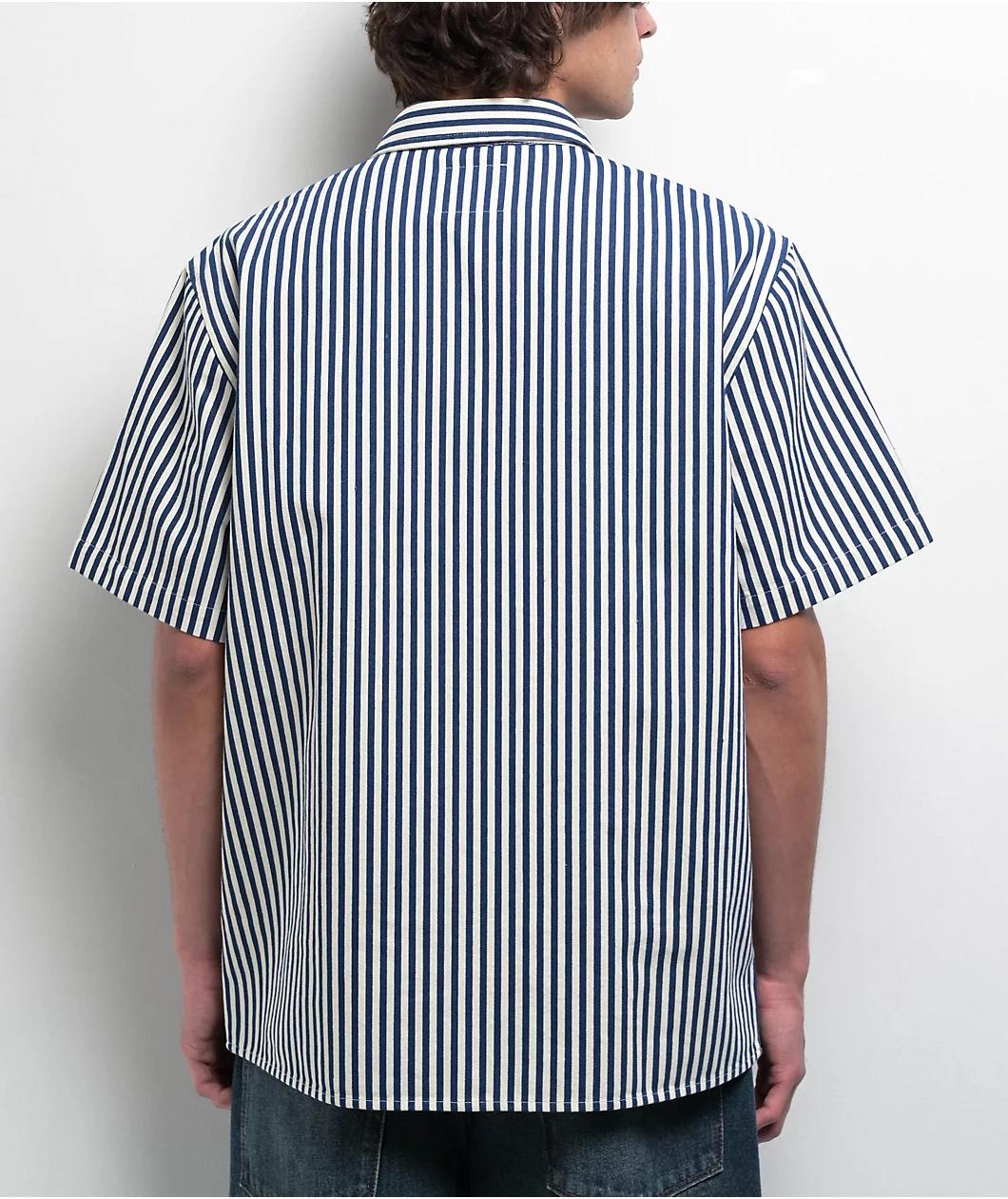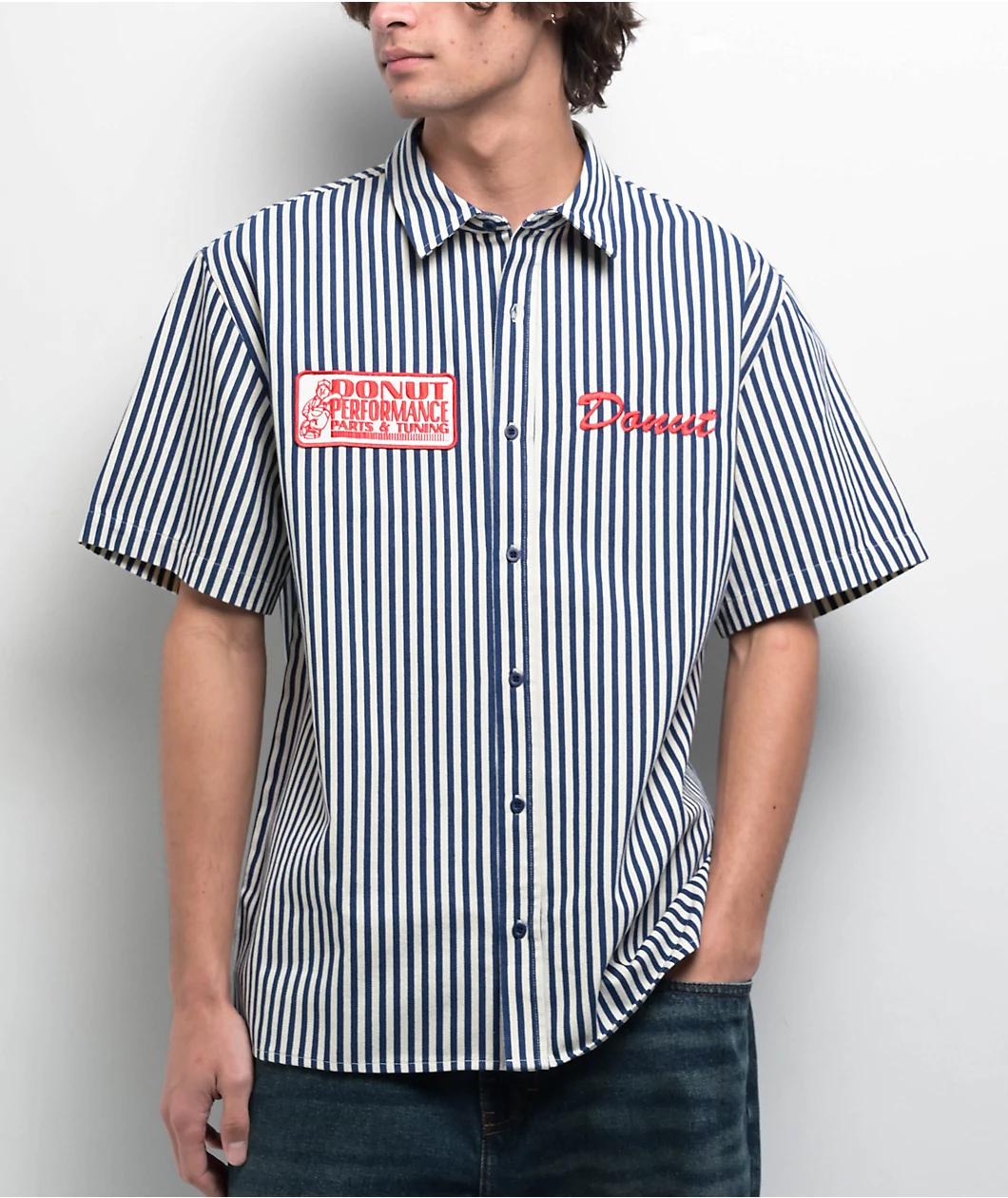 Delivering a thrifted vibe, the Performance Parts work shirt from Donut comes in a white and blue striped motif. Embracing a traditional undertone, this shirt has embroidered branding on the left and right side of the chest in a vibrant red colorway.