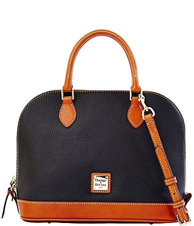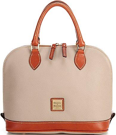 From the Pebble Collection by Dooney & Bourke, the Zip Zip Dome Satchel Bag features:Pebble leatherGold-tone metal hardwareTop zip closureInterior zip pocket, slip pocket, and phone pocketProtective feetDouble handle; detachable adjustable strapApprox. 12.75L x 9.5H x 6D; 4 handle drop; 15.5 strap dropWeight approx. 1 lbs.Imported.
