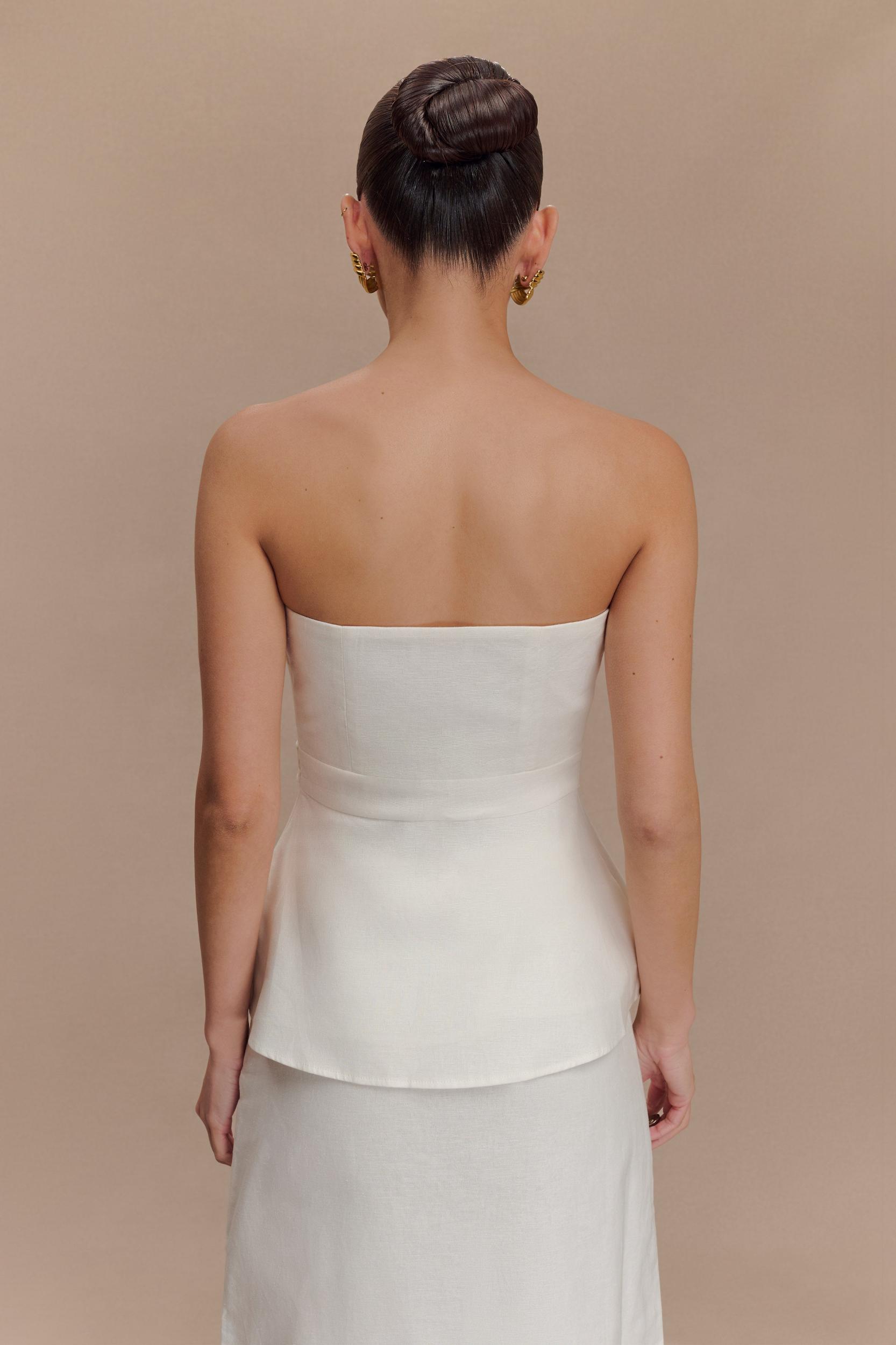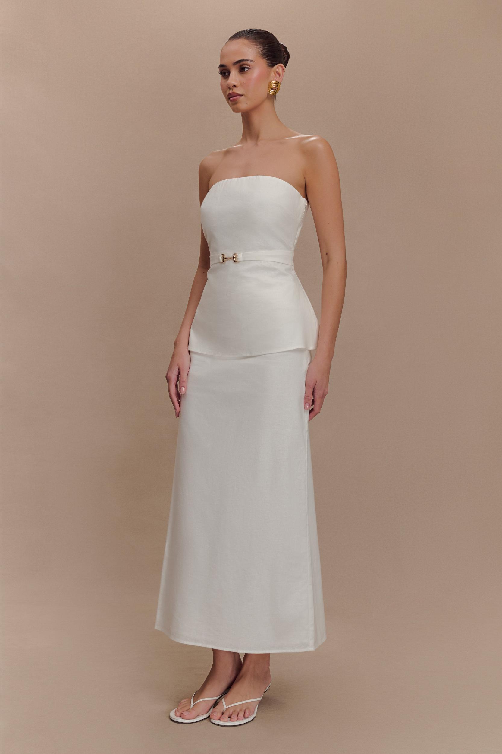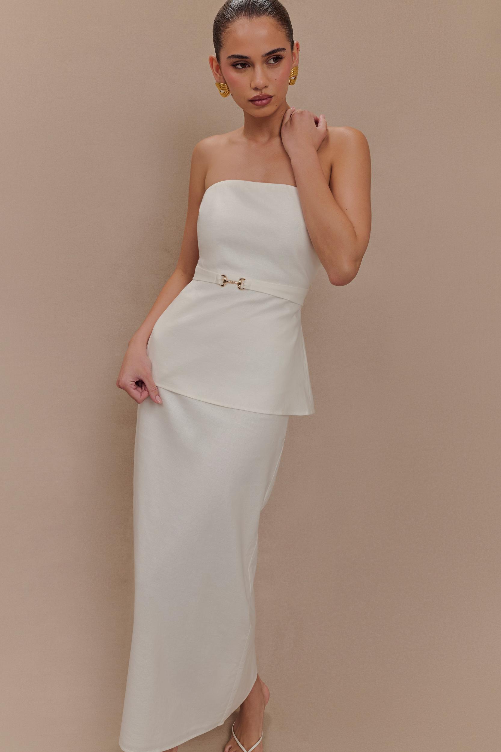Sleek, stylish, and so sophisticated. The DORA Strapless Linen Top is the perfect fusion of chic elegance and contemporary style. Featuring a strapless design and longline silhouette, this top is both flattering and versatile. The belted waist detail cinches the figure, with a stylish centre front buckle adding a bold touch. Finished with a side zip for easy wear, this top is ideal for pairing with everything from tailored pants to skirts, offering effortless sophistication for day or night. Crafted from lightweight linen, it’s the ultimate piece to add fresh, breathable style to your wardrobe. Pair with the Dora Linen Midi Skirt for a sleek, coordinated look.