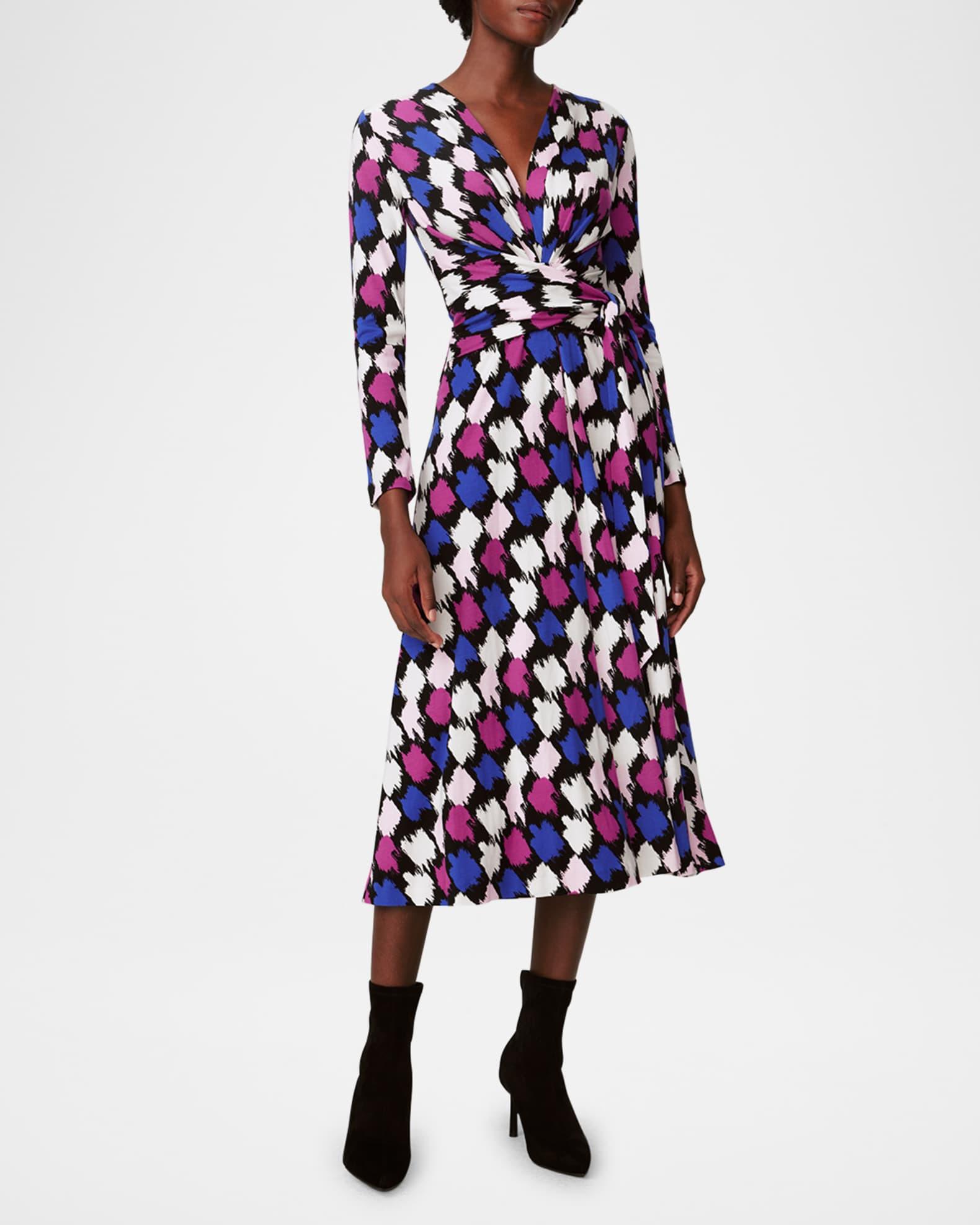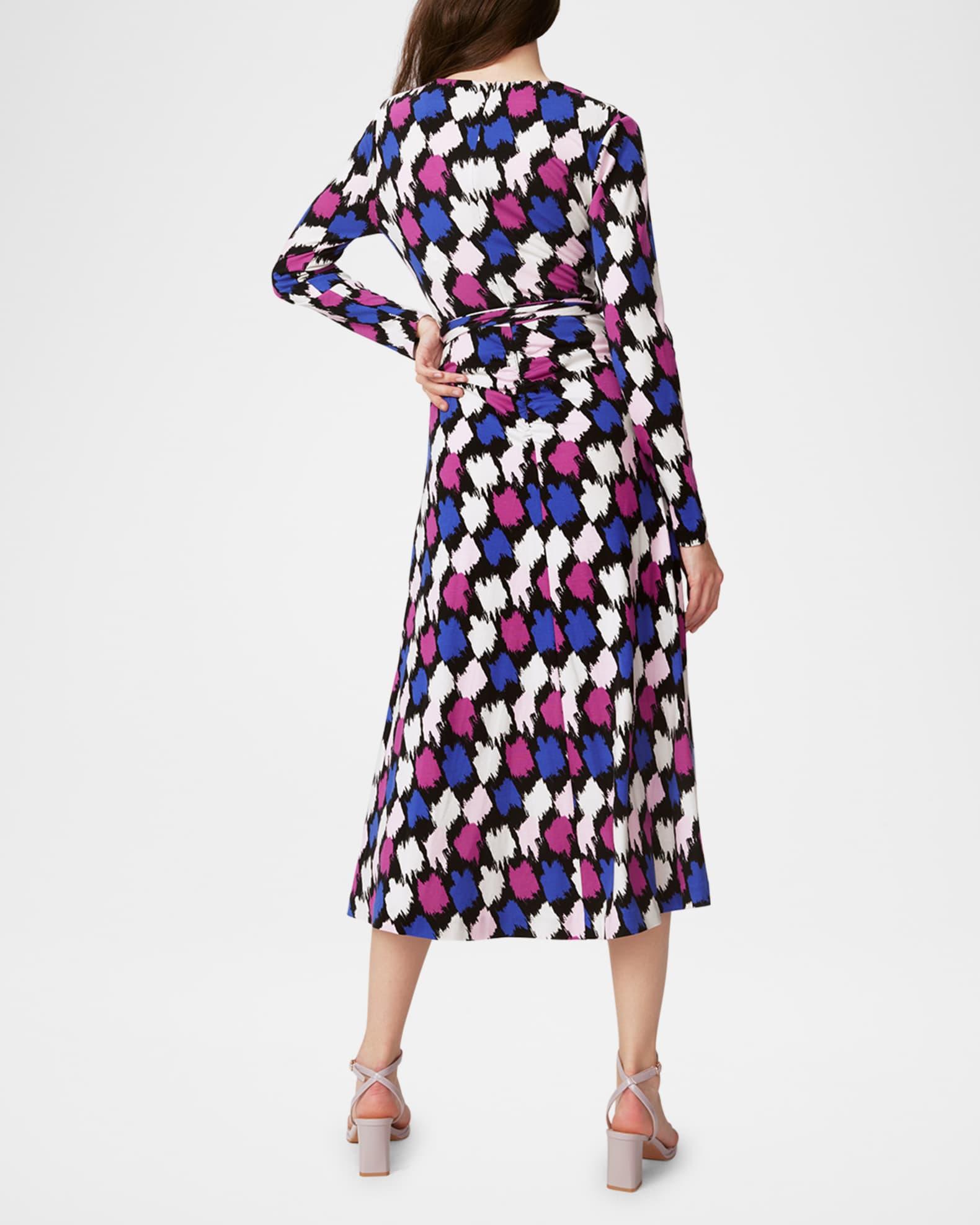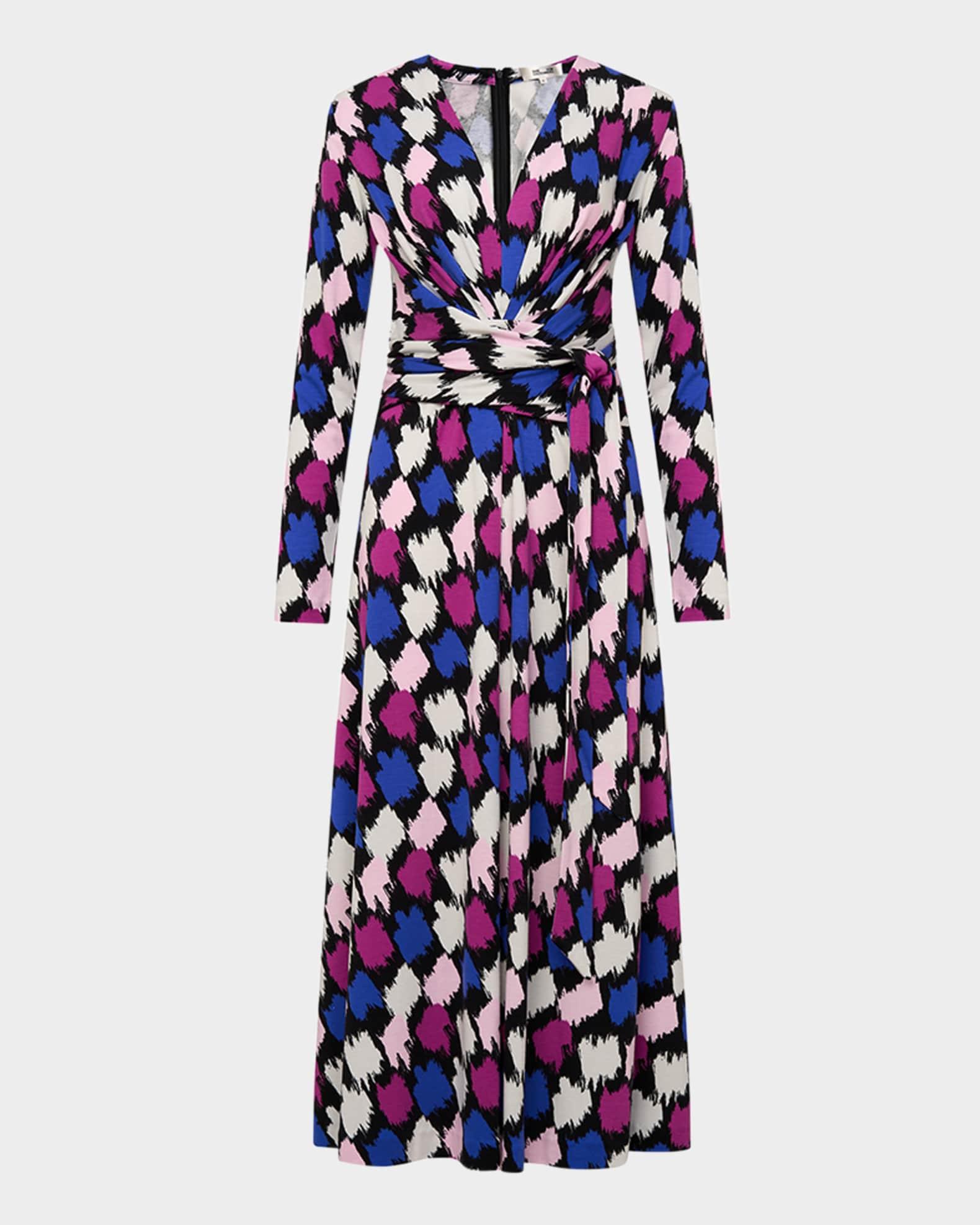 Diane von Furstenberg "Dorothee" midi dress in a brushstroke print V neckline Long sleeves Wrapping waist self-tie Hem falls below the knee A-line silhouette Invisible back zipper Lyocell/wool Dry clean Imported Model is 5'10"/177cm.