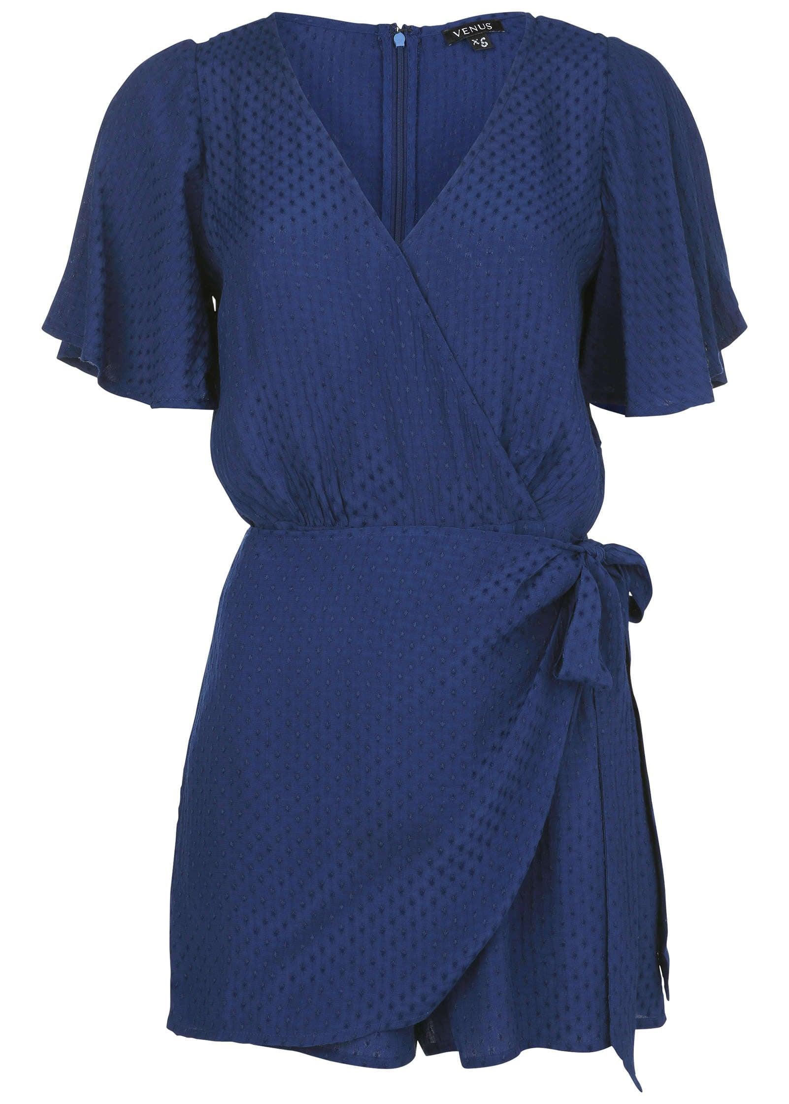 This romper does it all! The wrap-around detail gives the illusion of a flirty skirt in the front, while the comfy shorts keep things effortless. With its breezy dotted fabric and waist-cinching tie, this is your go-to for an easy, chic look—day or night.