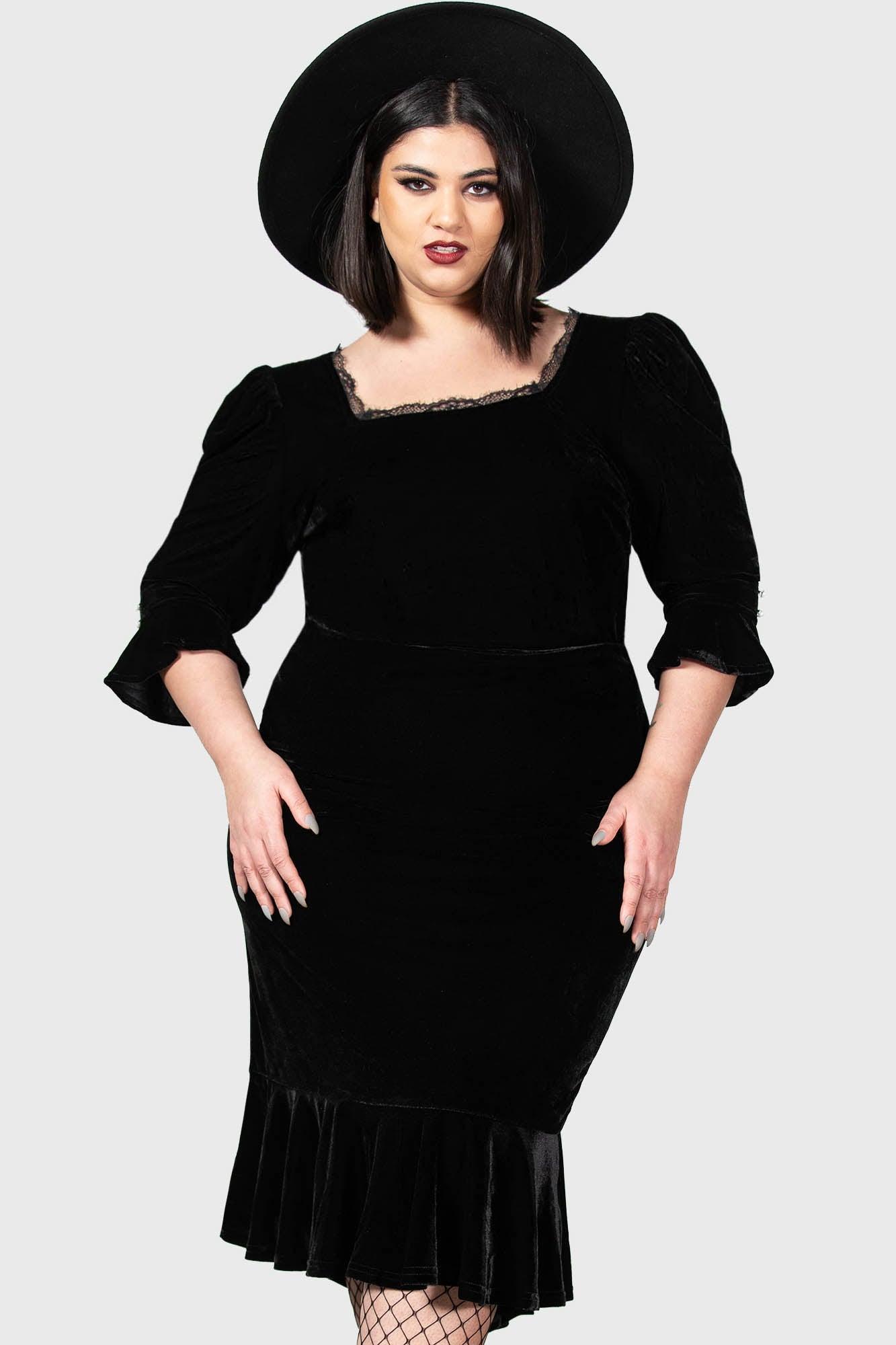 DOTTIE DOTTIE.- Soft, stretch velvet.- Lace trims.- Square neck.- 3/4 length sleeves with ruffle.- Pearlescent buttons.- Cropped.- Back button closure.- Fitted.With KILLSTAR branding, 95% Polyester 5% Elastane.Machine wash cold (30°c) / Do not bleach / Do not tumble dry / Iron at low temperature / Do not dry clean.