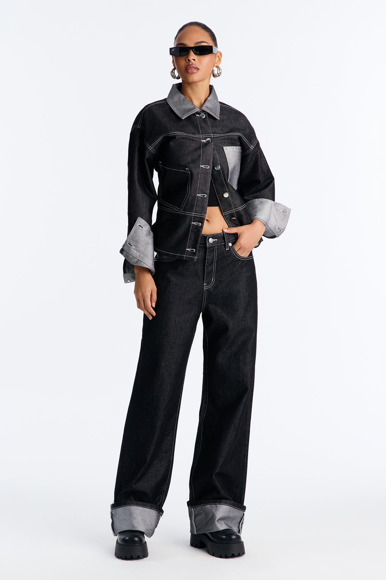 Available In Black Wash. Pair With Double Agent Cuffed Wide Leg Jeans Denim Jacket Collar Button Closure Chest Pockets Two Tone Non-Stretch Authentic Denim Disclaimer: Due To The Specialized Wash, Each Garment Is Unique. 65% Cotton 35% Polyester Imported California Proposition 65WARNING: Cancer and Reproductive Harm - www.P65Warnings.ca.gov.