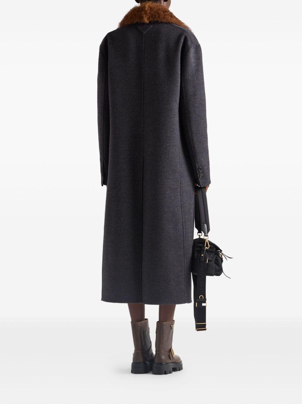 Prada double-breasted coat | Black | grey | double-breasted fastening | flap pockets | back vent | long sleeves | triangle logo | Fabric | Double Breasted & Peacoats | Coats | Clothing | Women