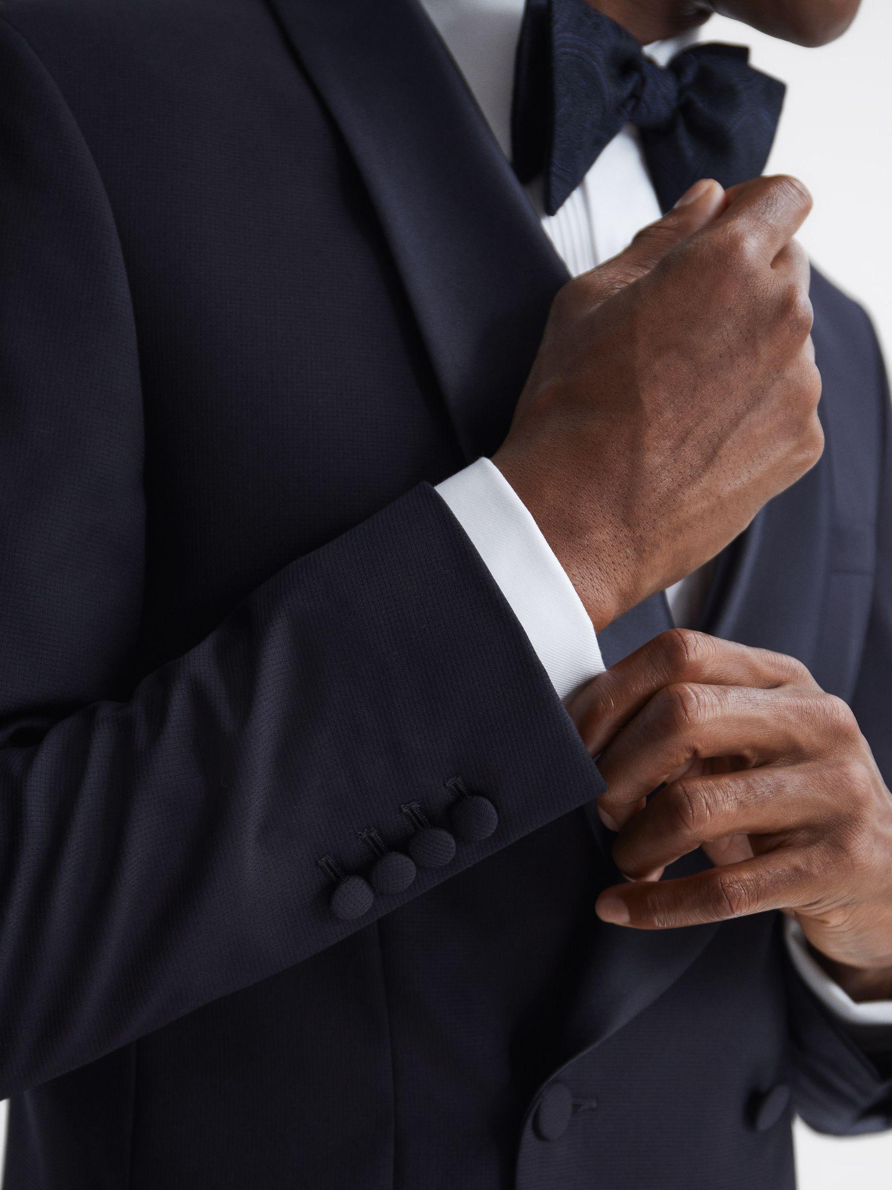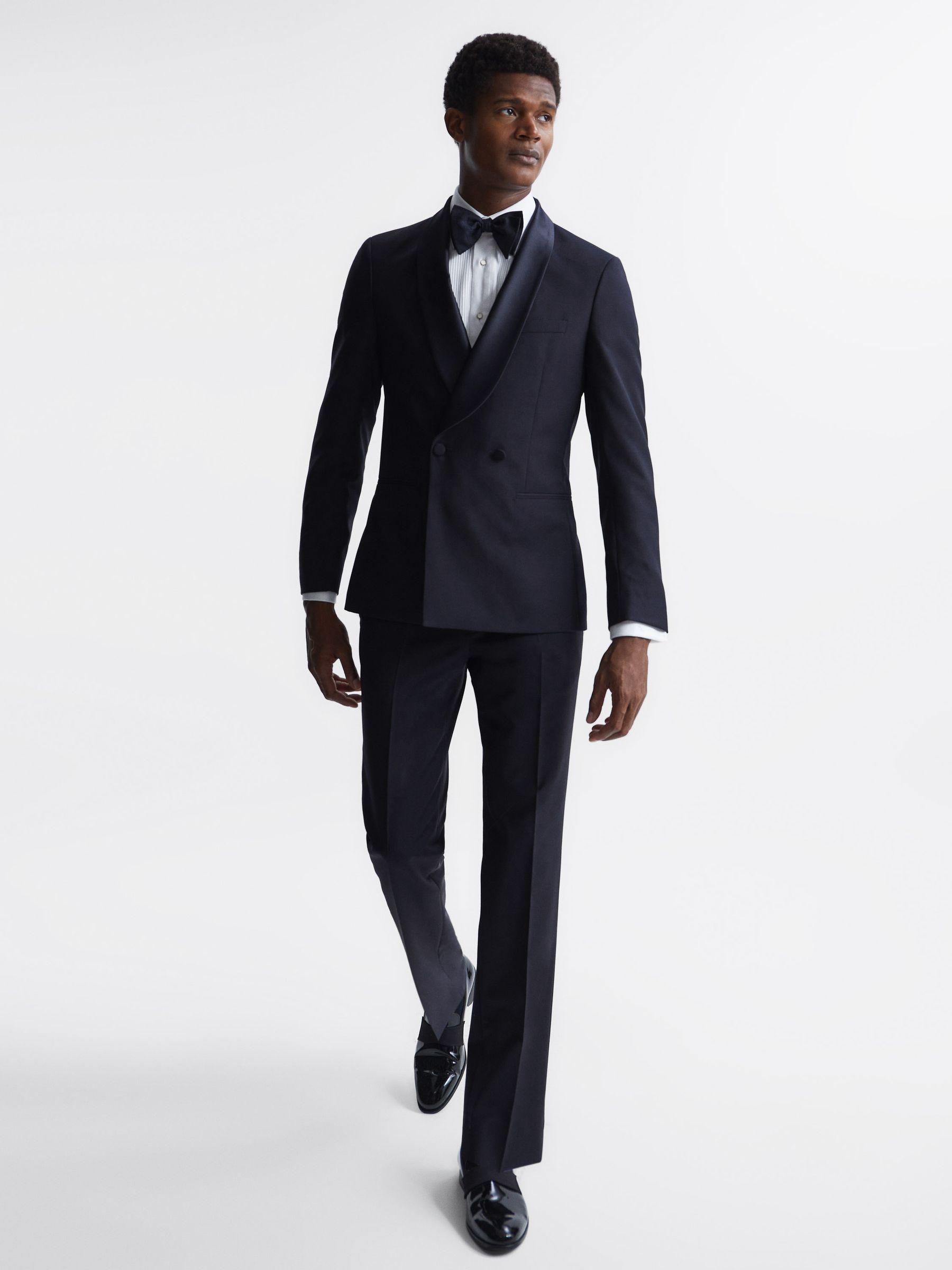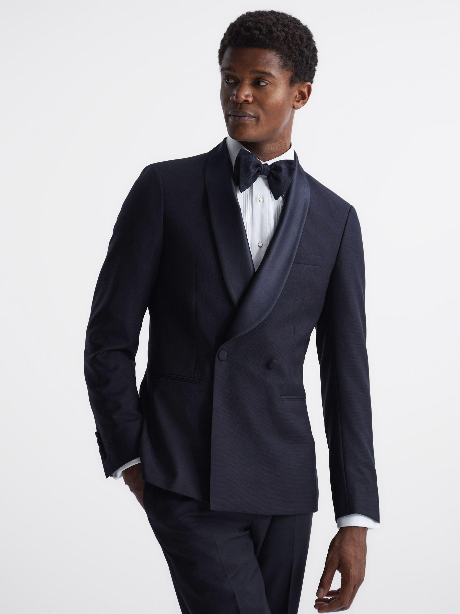 The Expose double breasted blazer in navy is crafted from 100% wool for a textured finish and features satin shawl lapels. This contrast adds a lustrous look and handle, making it a standout occasion piece. Buttoned cuffs and a double vent to the rear are added to maintain the tailored look and feel of the garment. Style over a dress shirt and add a bow tie for a sleek formal edit. Double-breasted. Satin shawl lapels. Buttoned front. Buttoned cuffs. 100% wool. Textured finish. Dual jetted pockets to hip. Chest welt pocket. Internal pockets. Double vent to rear. Fully lined. The model is wearing a size 38. Measurements of model: Height 6ft 2.5" / 189cm.